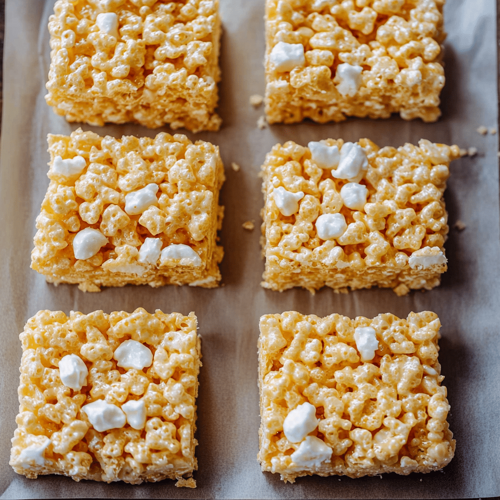 Immediately sprinkle the remaining 2 cups of marshmallows on top, pressing them gently into the surface of the treats. - Cool and Serve: