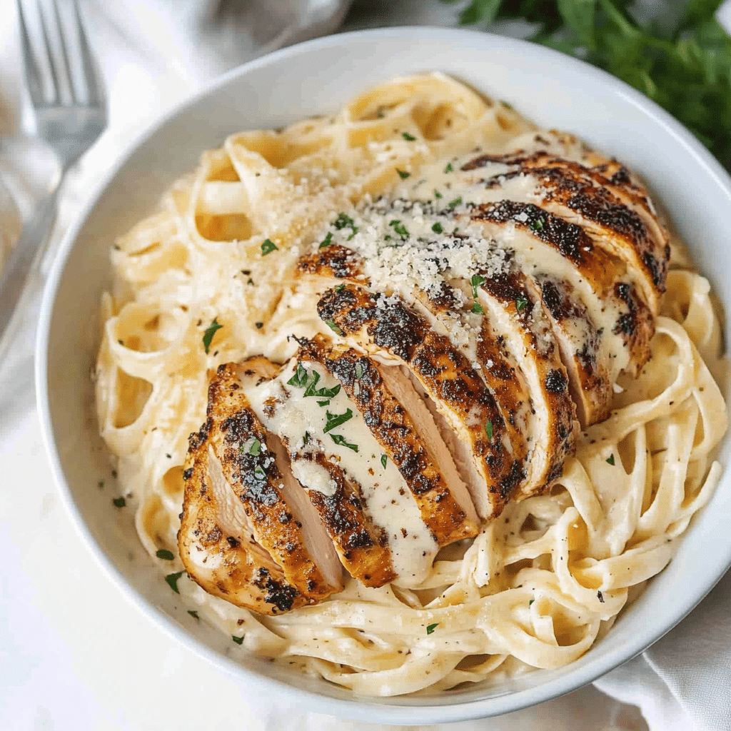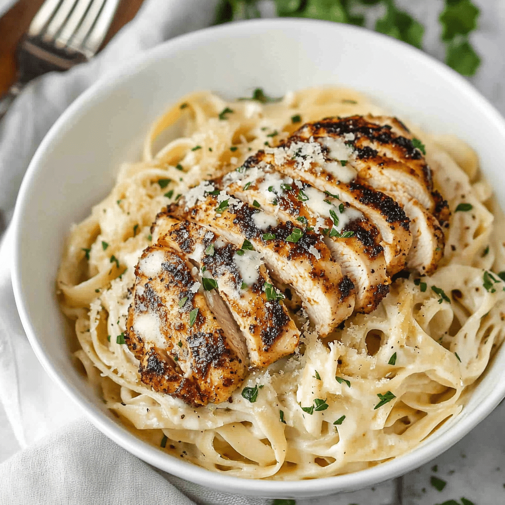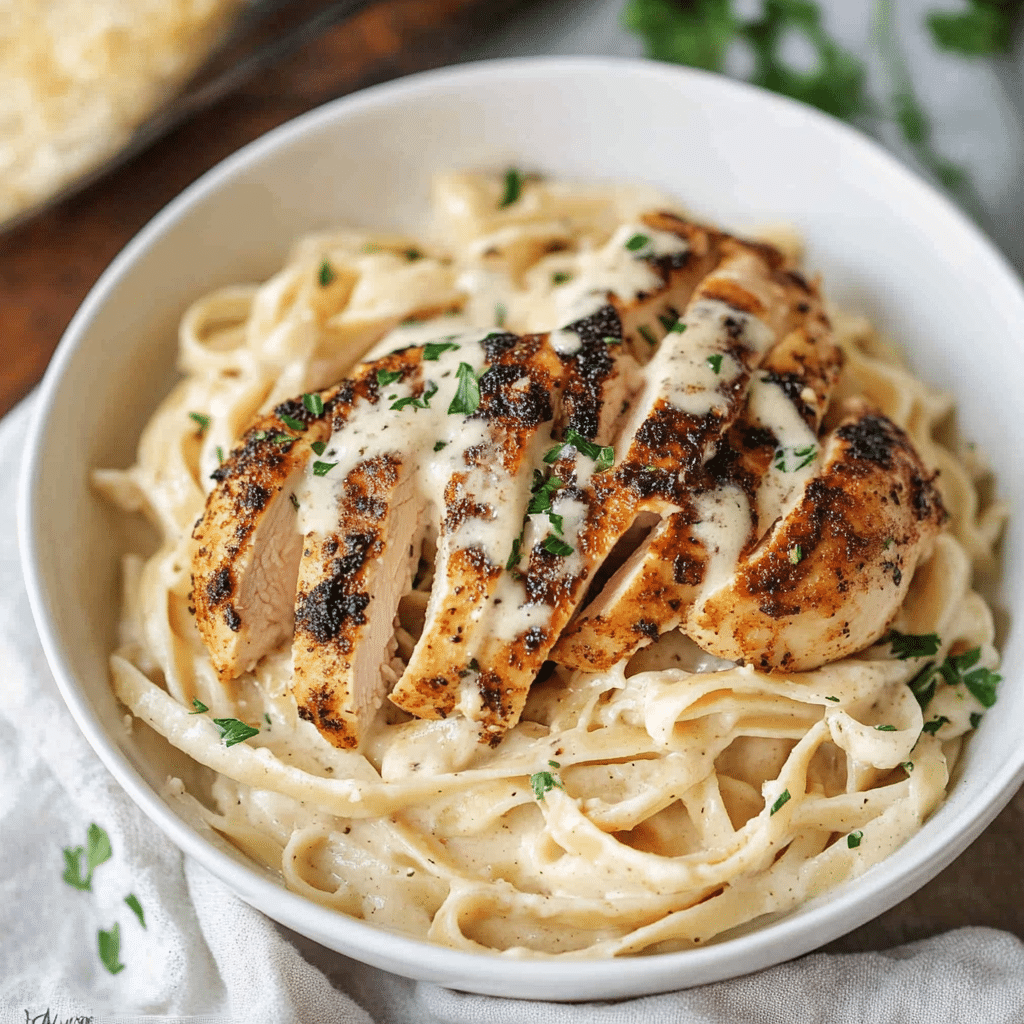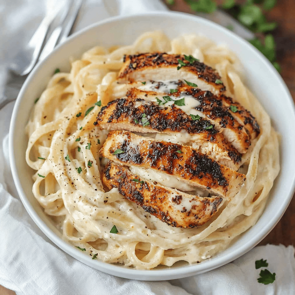 Blackened Chicken Alfredo is a bold and creamy twist on a classic pasta dish. Juicy, spice-rubbed chicken breasts are seared to perfection and served over tender fettuccine coated in a rich Parmesan cream sauce. This quick and satisfying dinner combines smoky heat and savory comfort in every bite.