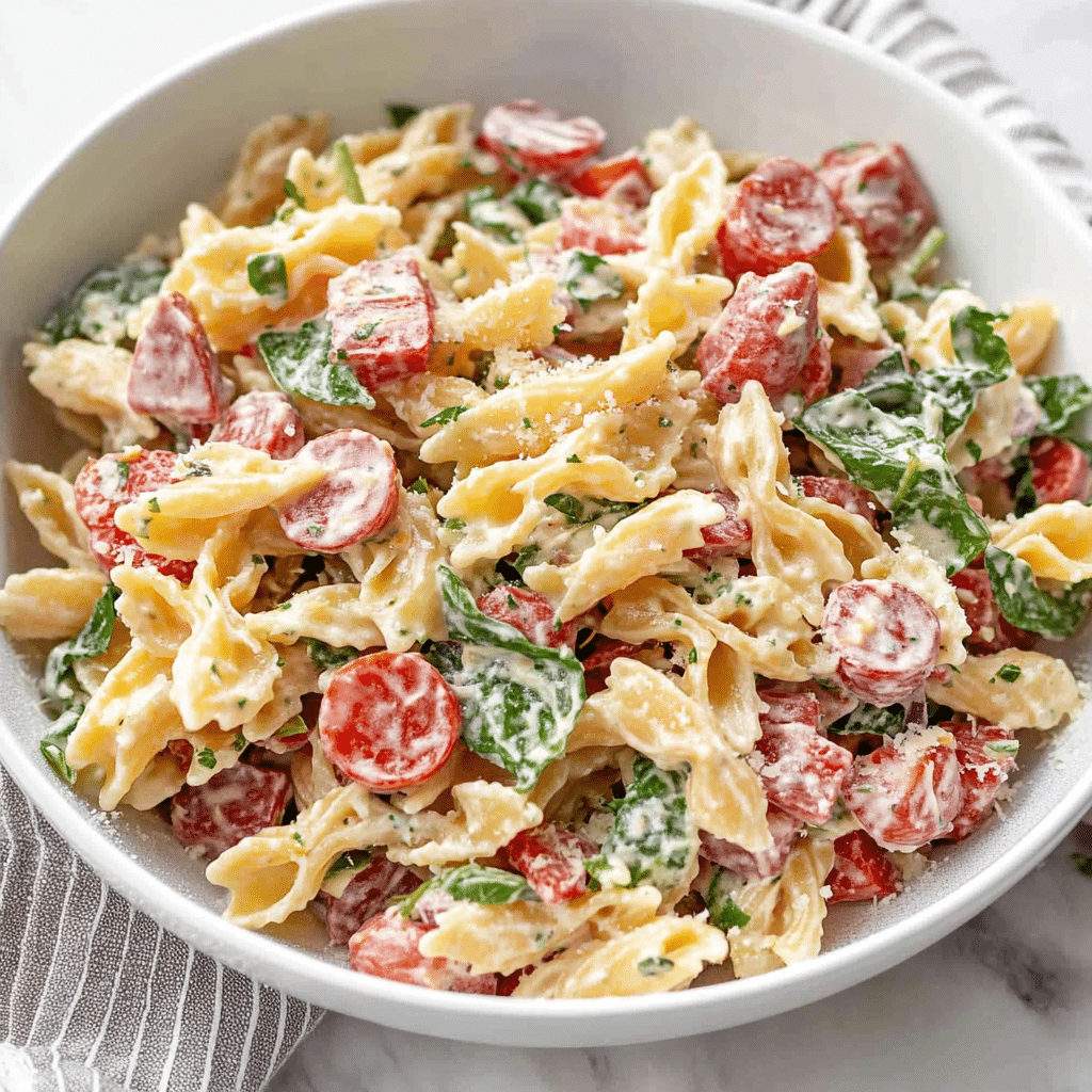 The creamy dressing coats the pasta beautifully, while the bacon provides crunch and the spinach and tomatoes add a refreshing contrast.