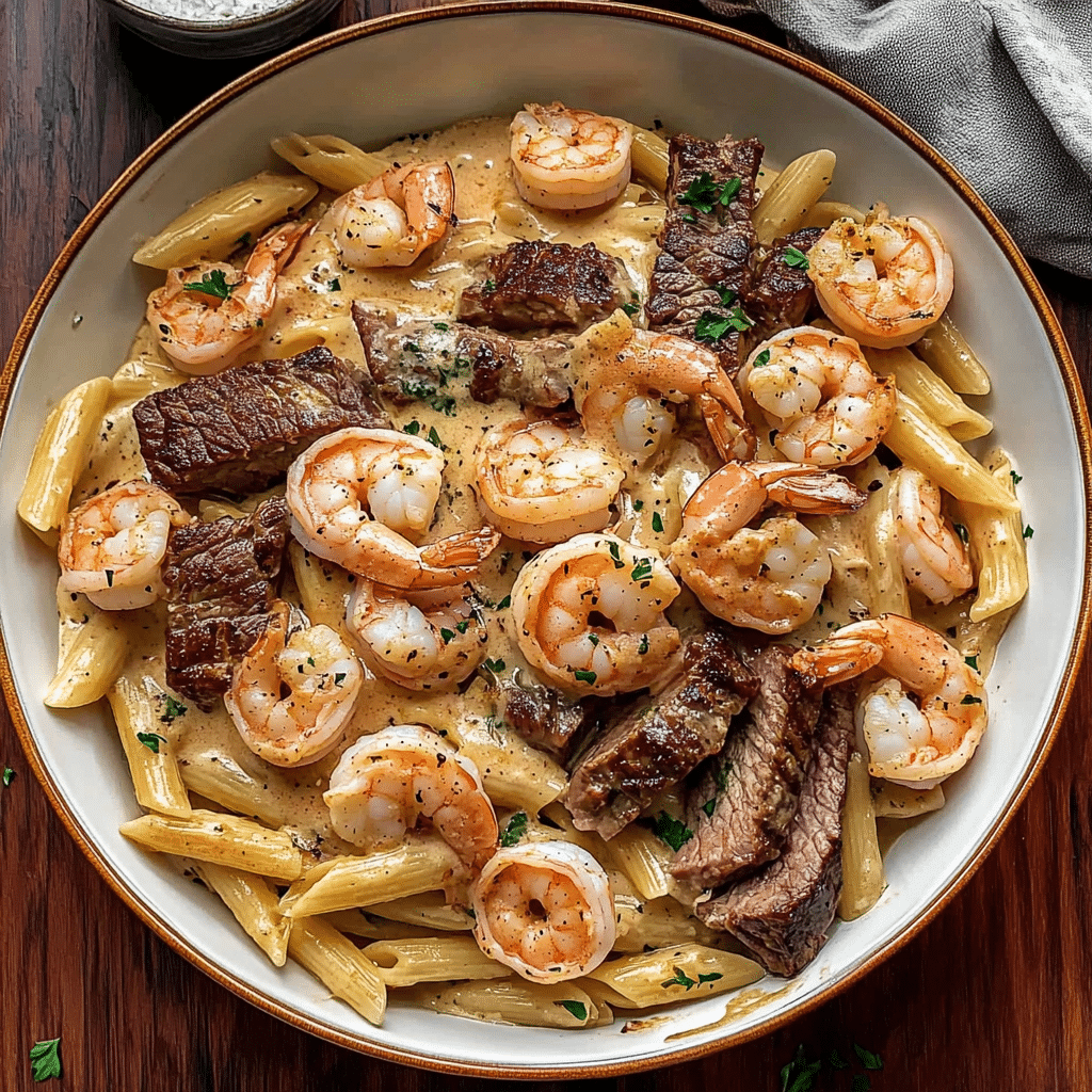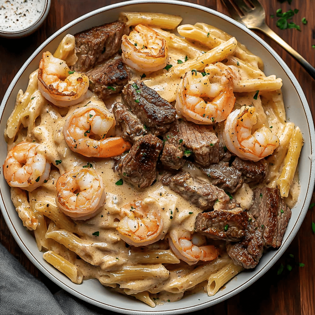 This recipe brings together the best of land and sea with robust flavors, creating a restaurant-quality meal that’s surprisingly easy to make at home. The steak is seared to perfection, while the shrimp cooks quickly in a lightly seasoned oil, keeping their natural sweetness intact. The sauce is rich but not overwhelming, with garlic and onion providing aromatic depth. Garnished with fresh parsley, this pasta is as visually appealing as it is delicious, making it perfect for both weeknight dinners and special occasions.