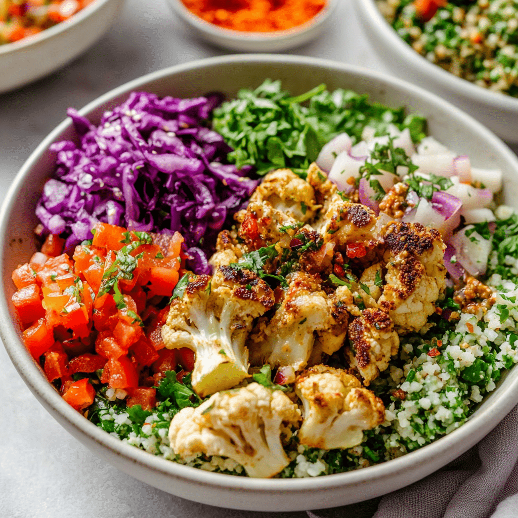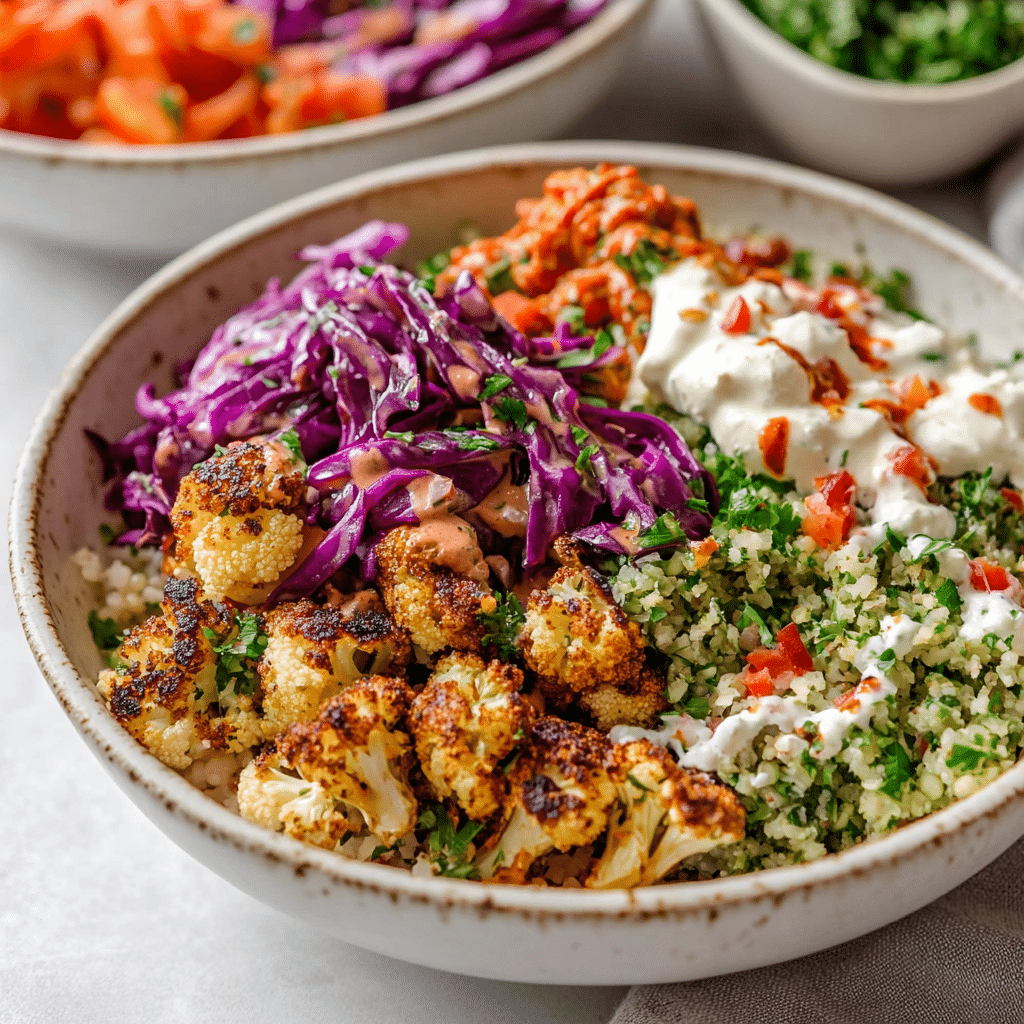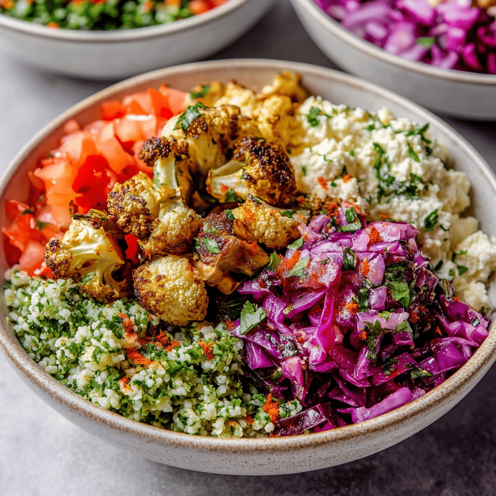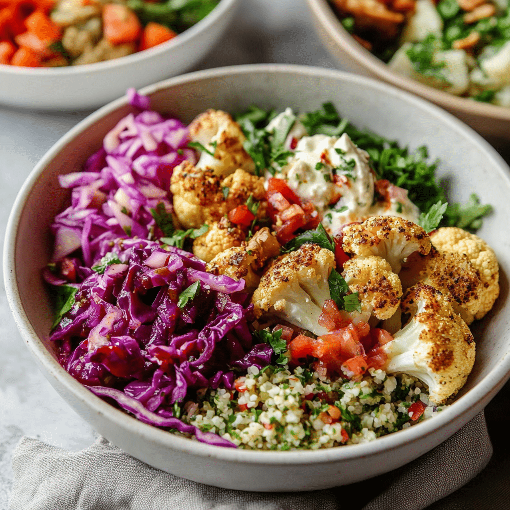 - Assemble Bowls: Add a scoop of roasted cauliflower, a portion of tabbouleh, pickled cabbage, a dollop of hummus, and a drizzle of tahini sauce to each bowl. Serve with pita wedges on the side.
