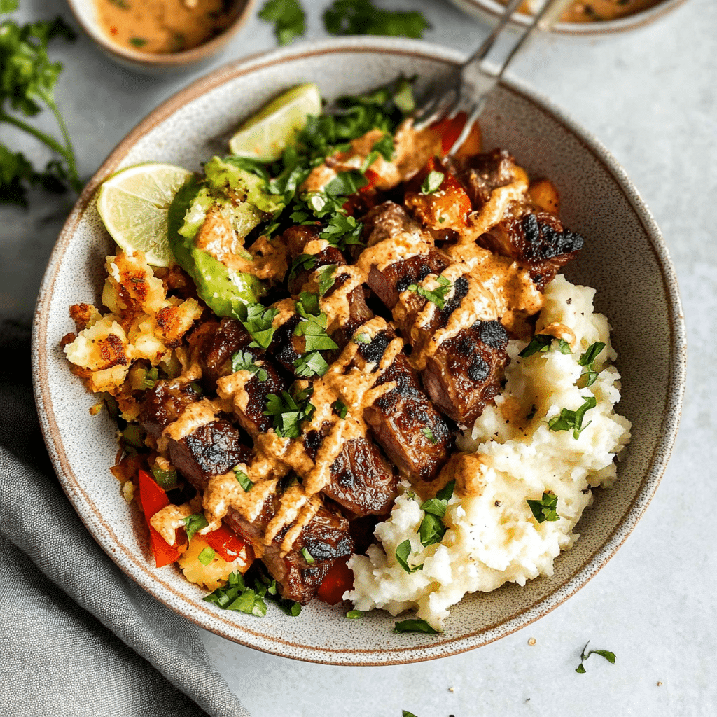 This Chicken Fajita Burrito Bowl combines tender, seasoned chicken with vibrant bell peppers, onions, and cilantro lime rice. Topped with black beans, chopped lettuce, pico de gallo, and a drizzle of chipotle aioli, it’s a flavorful and satisfying meal perfect for any day of the week.