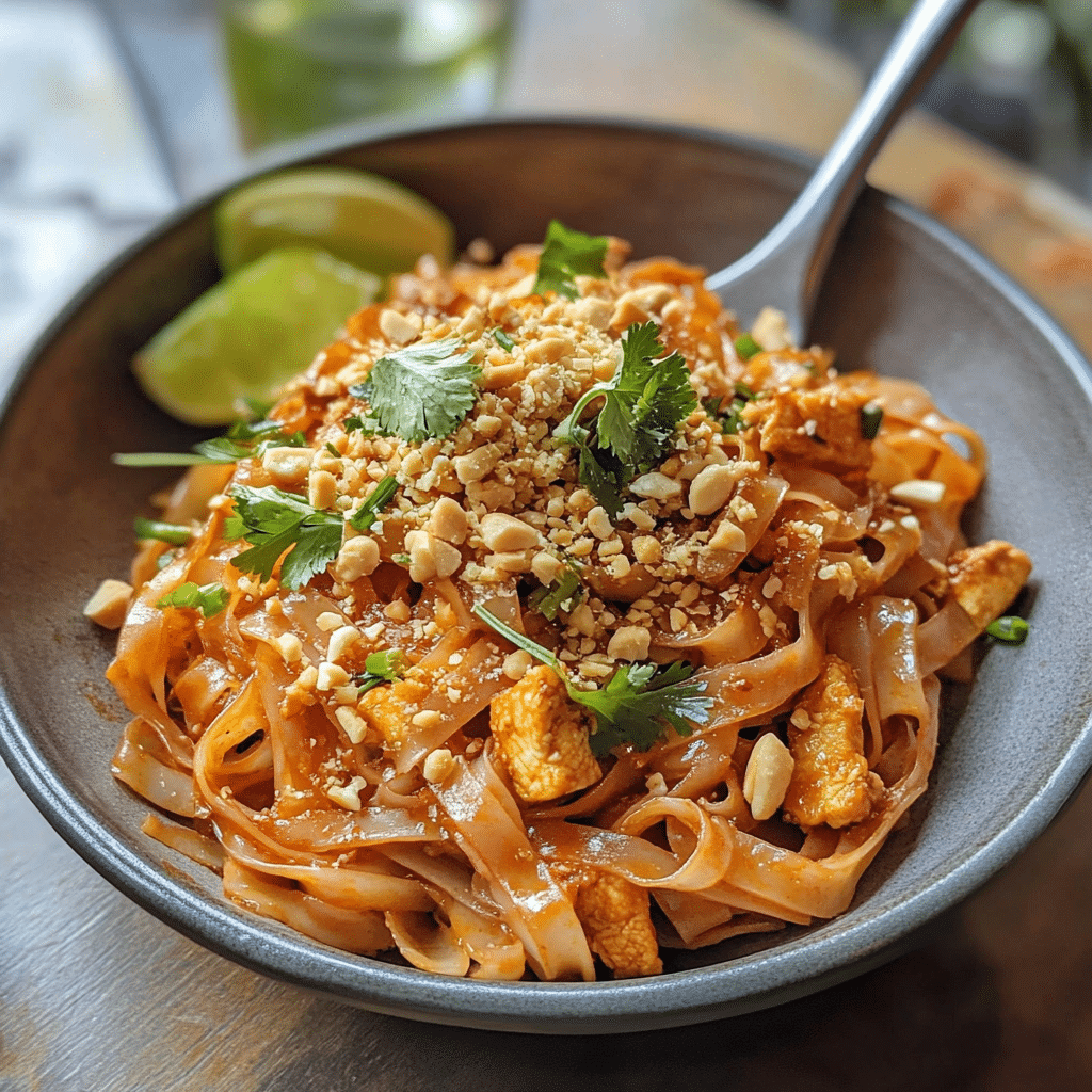 Serve Chicken Pad Thai hot, straight from the pan. Garnish with additional cilantro, crushed peanuts, lime wedges, or chili flakes. It pairs well with Thai iced tea, fresh cucumber salad, or steamed edamame. For presentation, use shallow bowls and tongs to twirl the noodles neatly.