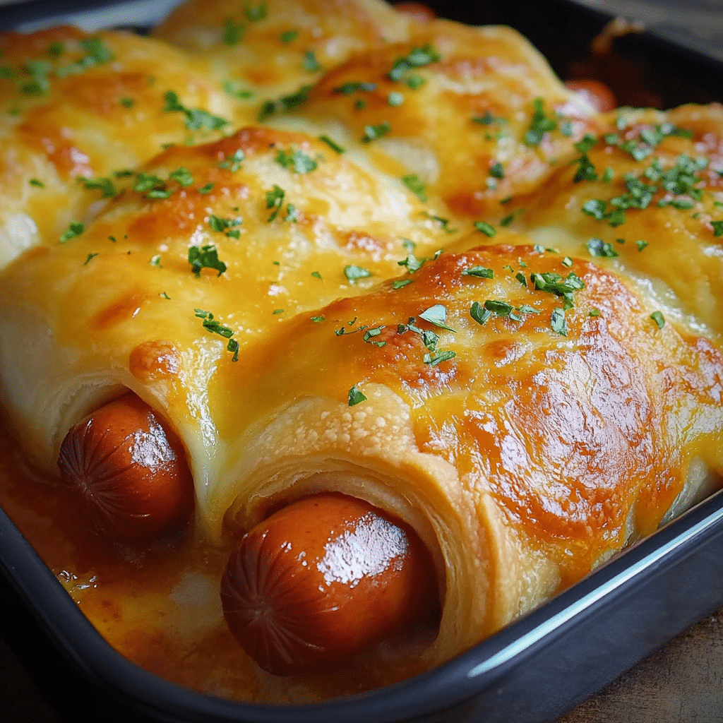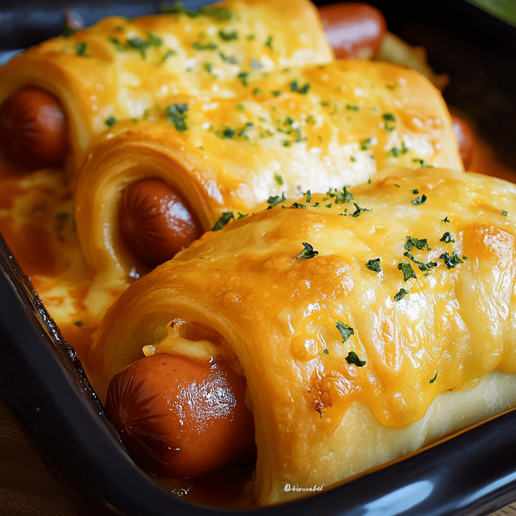 A fun and hearty twist on classic pigs in a blanket—these cheesy hot dogs are wrapped in golden, flaky pizza dough and baked to perfection, then smothered in warm chili and topped with a garlic butter drizzle. Perfect for game days, parties, or quick family dinners.