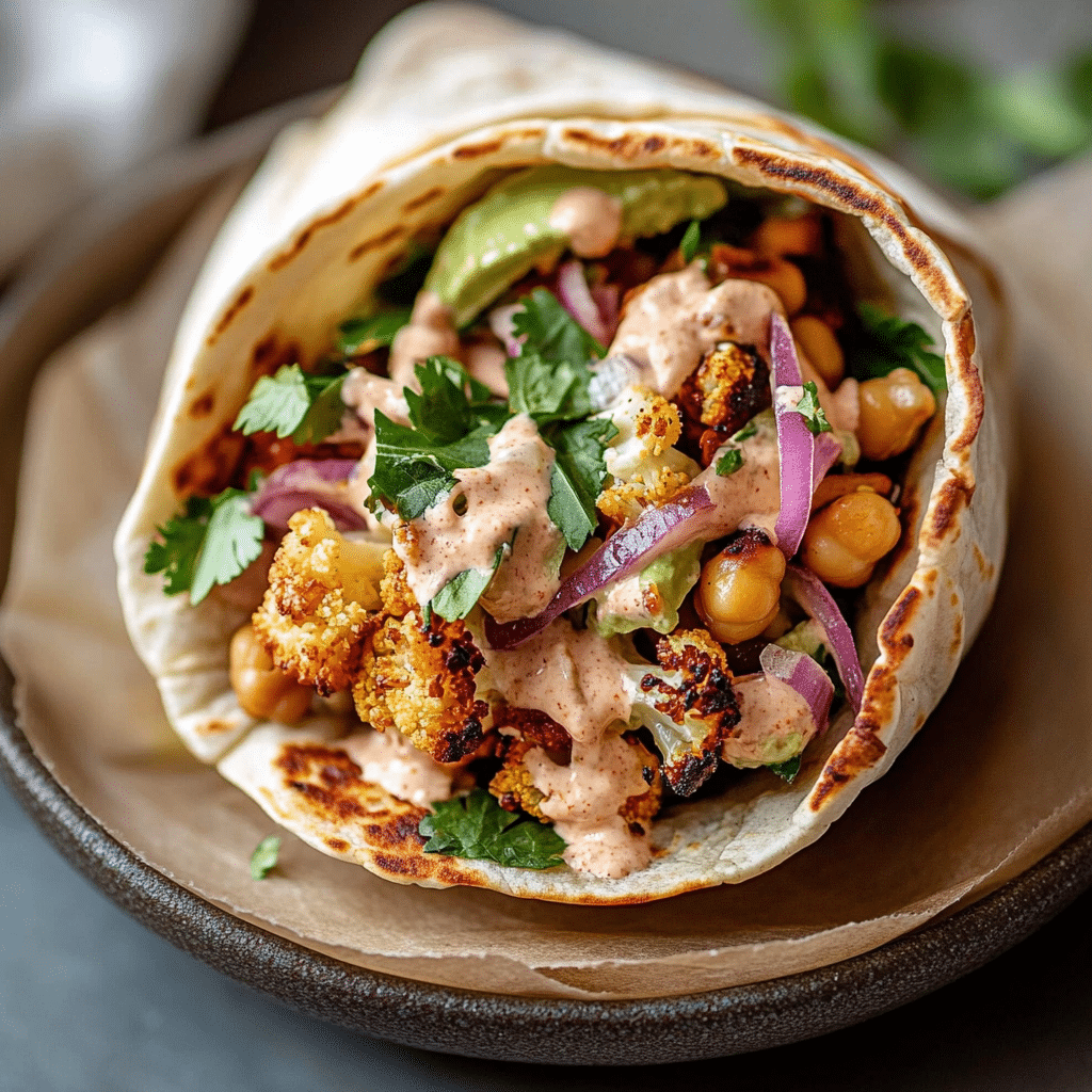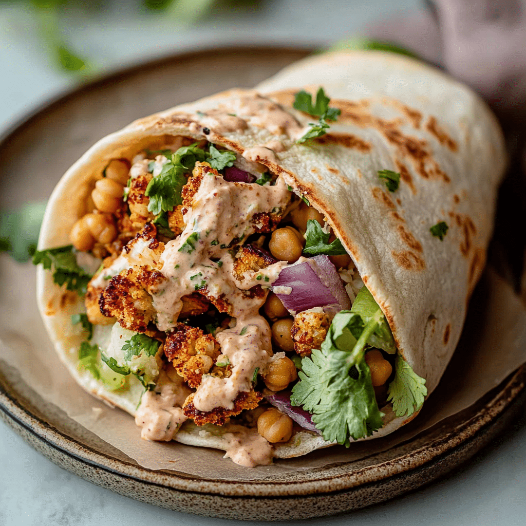 These Chili Lime Chickpea Cauliflower Wraps are a vibrant, plant-based meal that’s packed with bold flavors and textures. Roasted cauliflower and chickpeas are paired with a zesty chipotle yogurt sauce, quick-pickled onions, and fresh cilantro, all wrapped in soft pita or lettuce for a satisfying, healthy dish.