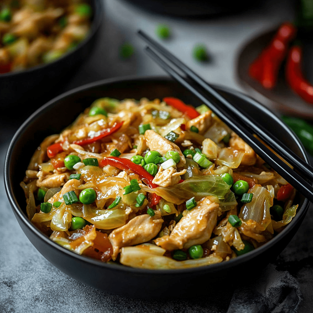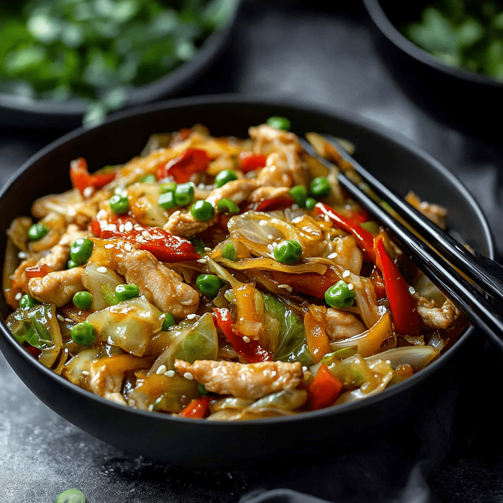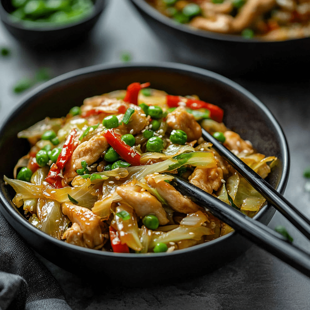 A vibrant and healthy stir-fry featuring tender chicken pieces, crisp cabbage, and a medley of colorful vegetables, all tossed in a savory sauce. This dish offers a delightful balance of flavors and textures, making it a perfect weeknight meal.