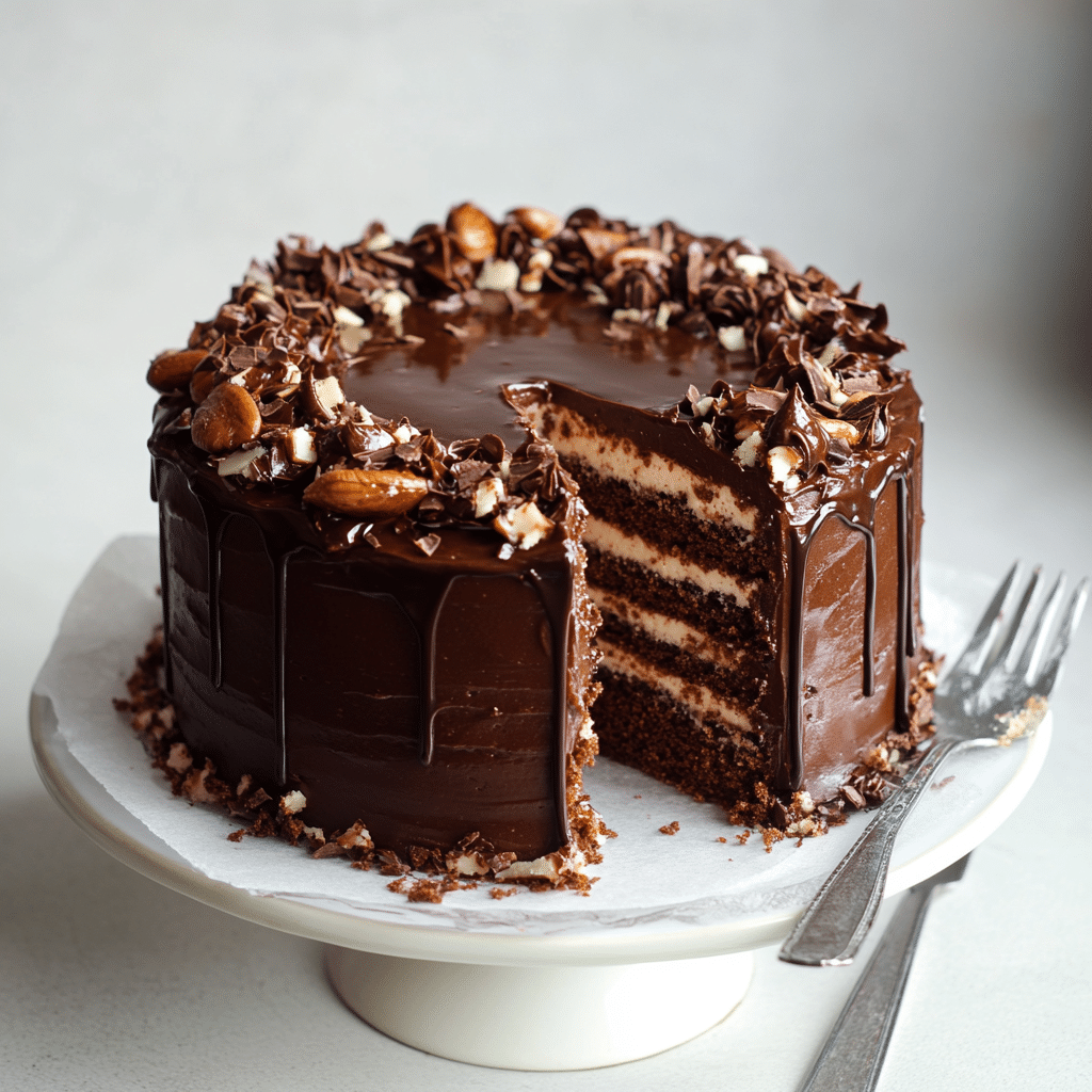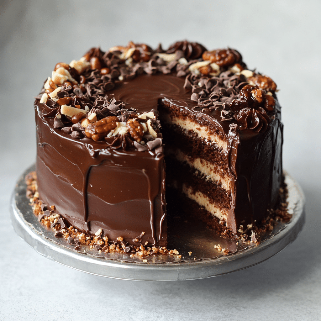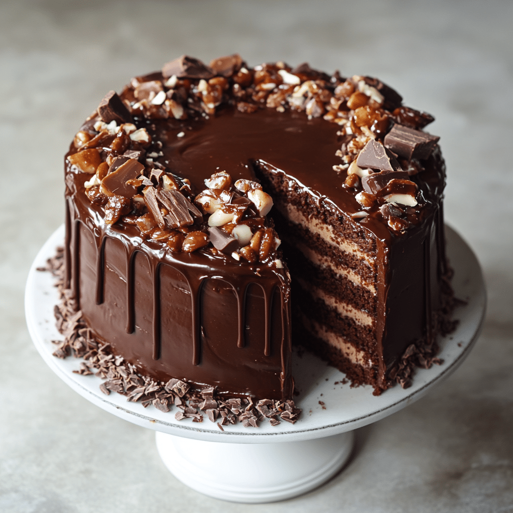 The rich chocolate cake is perfectly balanced by the sweet and slightly salty caramel filling, while the toasted pecans add a delightful crunch. The creamy chocolate buttercream ties it all together, creating a dessert that’s as beautiful as it is delicious. With each bite, you’ll experience layers of complex flavors—from the deep cocoa of the cake to the caramel’s buttery sweetness, with the nuts adding a satisfying texture. Perfect for any chocolate lover, this cake is guaranteed to become a favorite at your next gathering.