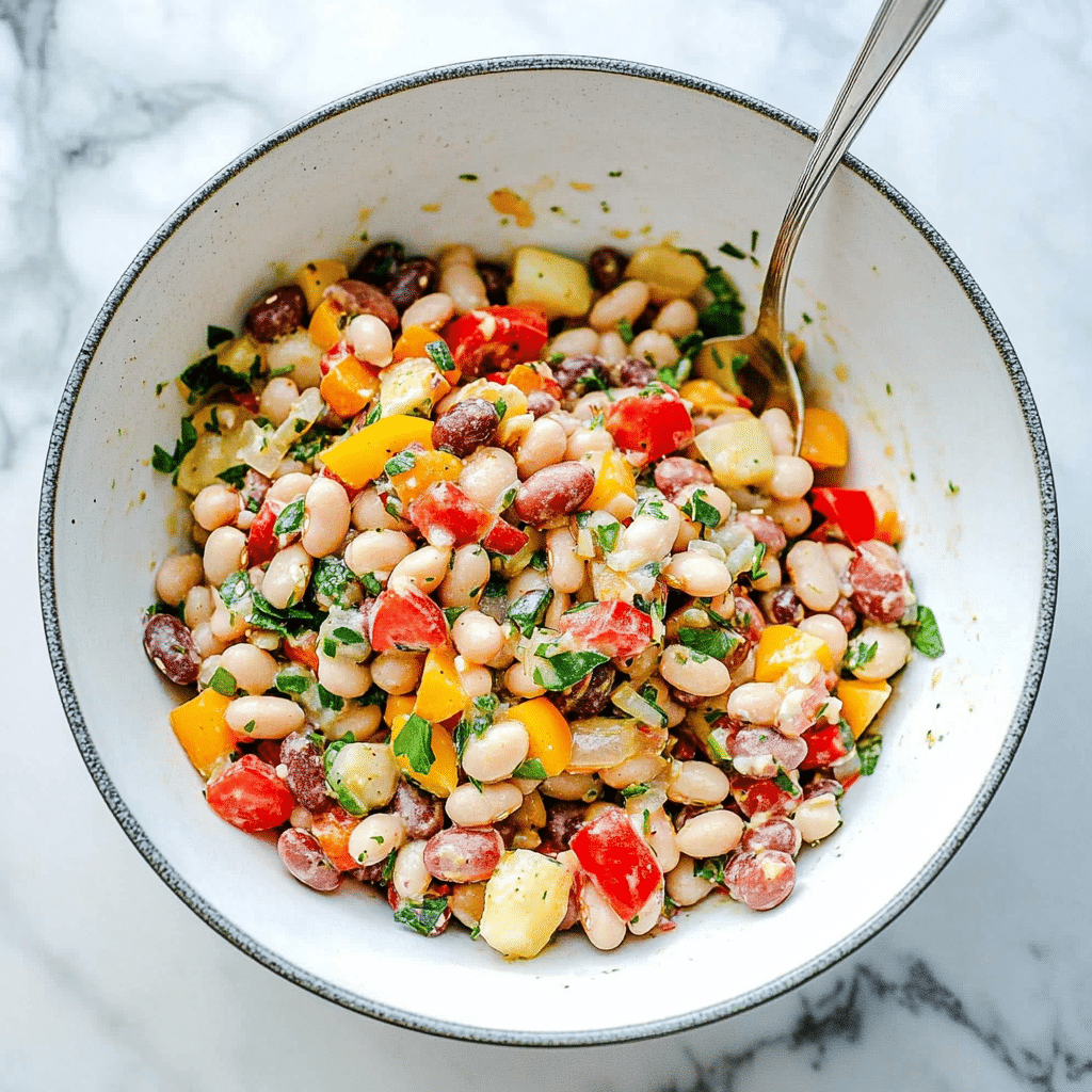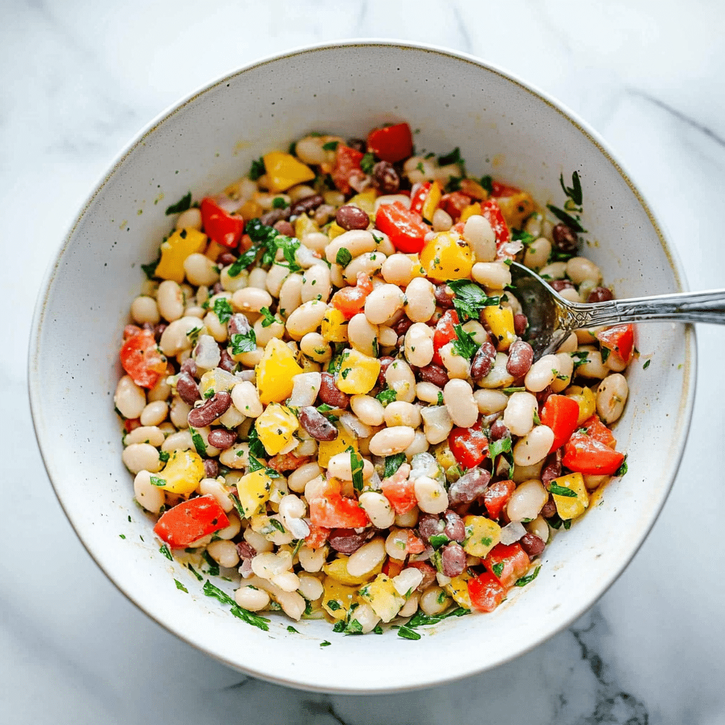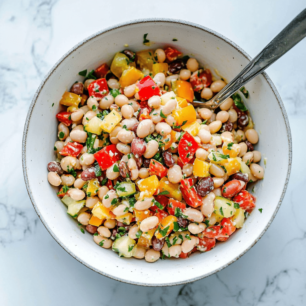 Packed with vibrant vegetables, hearty beans, and a zesty dressing, the Colourful Rainbow Bean Salad is a celebration of freshness, texture, and flavor. Whether you’re looking for a healthy lunch, a lively side dish, or a crowd-pleasing potluck option, this salad delivers on all fronts. The mix of red and yellow peppers, fennel, red onion, and sun-dried tomatoes provides a colorful and nutrient-rich foundation, while white beans offer a creamy contrast and satisfying protein. Topped with freshly grated Parmesan and fragrant herbs, the salad is brightened with a red wine vinegar and Dijon mustard vinaigrette that ties everything together.