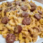 The base of the sauce blends tomato sauce, tomato paste, and heavy cream to create a balanced, velvety texture. Garlic, Italian seasoning, and a touch of dried parsley infuse the dish with flavor, while parmesan cheese adds a salty, creamy finish. The smoked sausage brings a savory depth that pairs perfectly with the rich sauce and pasta, making every bite flavorful and comforting.