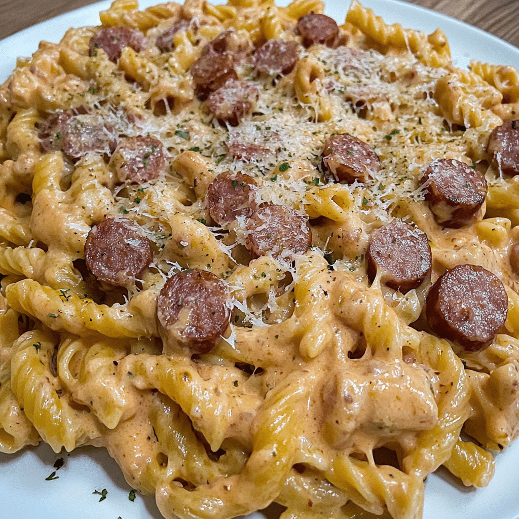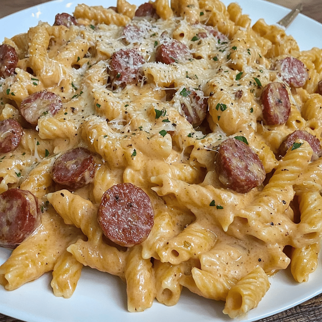 A rich and flavorful pasta dish combining smoky kielbasa with a creamy tomato sauce, garlic, and Parmesan cheese. This comforting meal comes together quickly and is perfect for satisfying weeknight dinners.