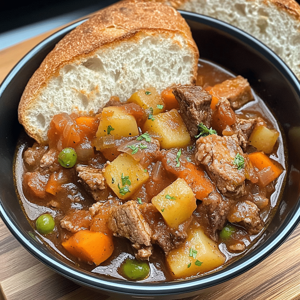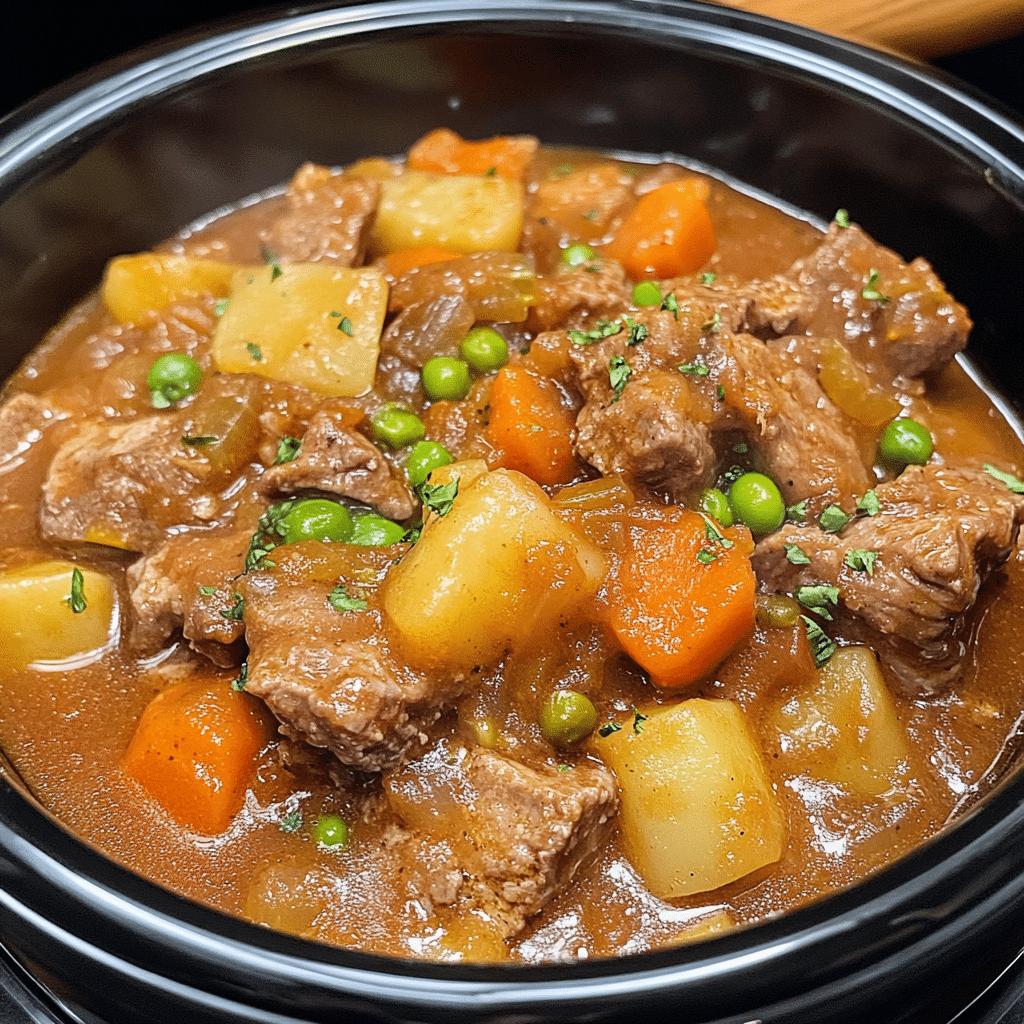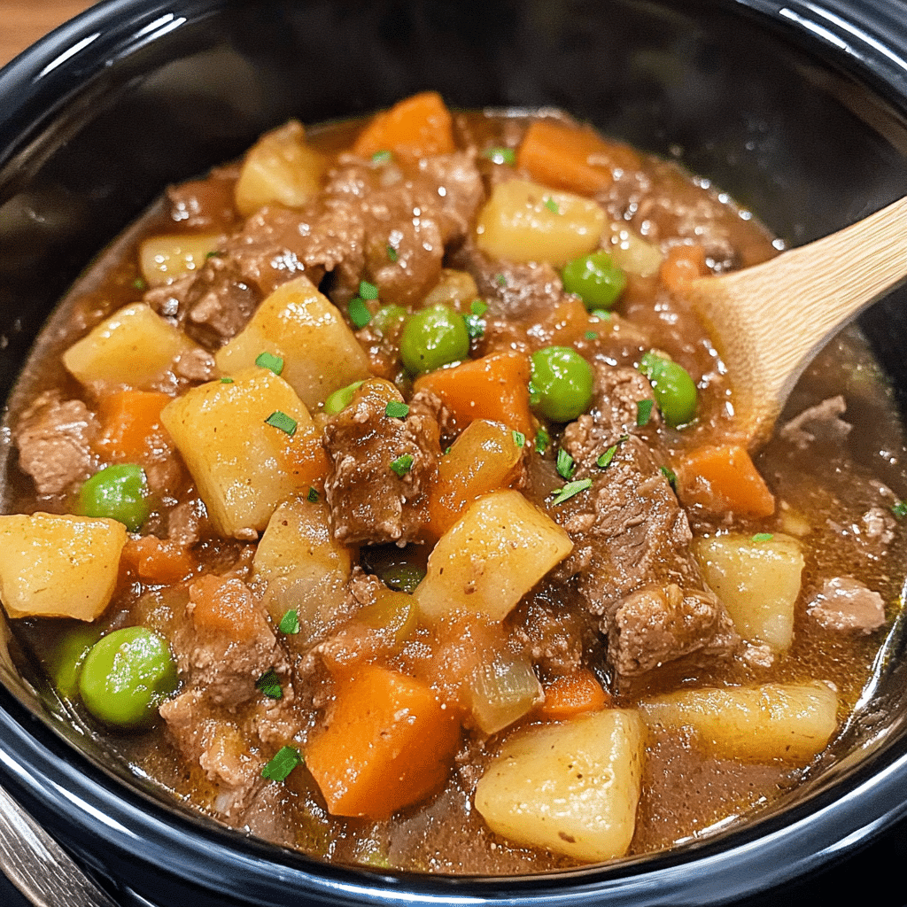 A hearty and comforting beef stew slow-cooked to perfection with tender chuck roast, fresh vegetables, and rich seasonings. This classic crock pot stew is perfect for a warming family meal with deep, savory flavors enhanced by red wine and herbs.