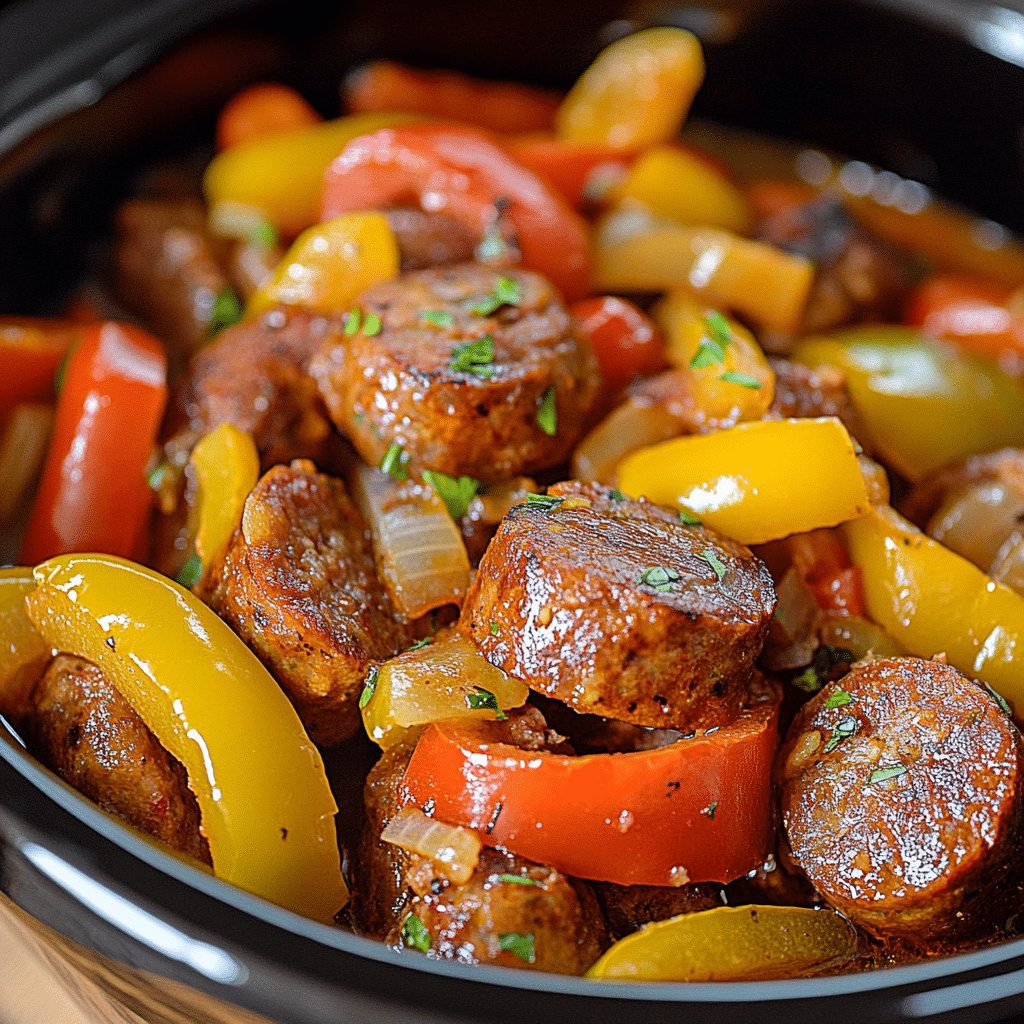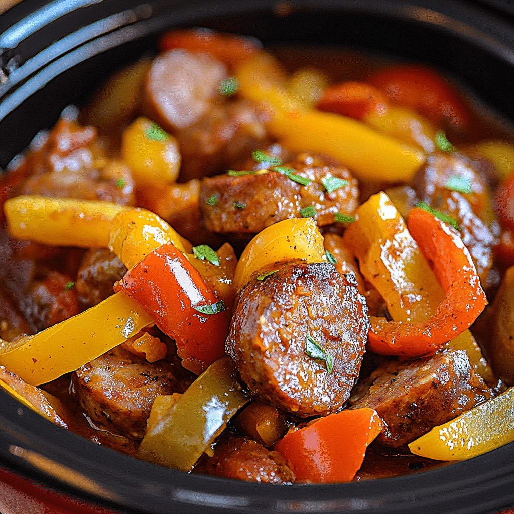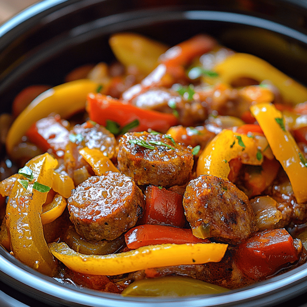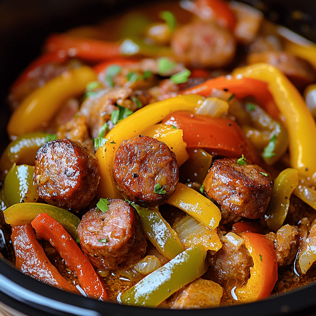A hearty and flavorful slow-cooked dish combining Italian sausages, colorful bell peppers, and onions simmered in a rich marinara sauce. Perfect for an easy, satisfying meal served in buns or over pasta.