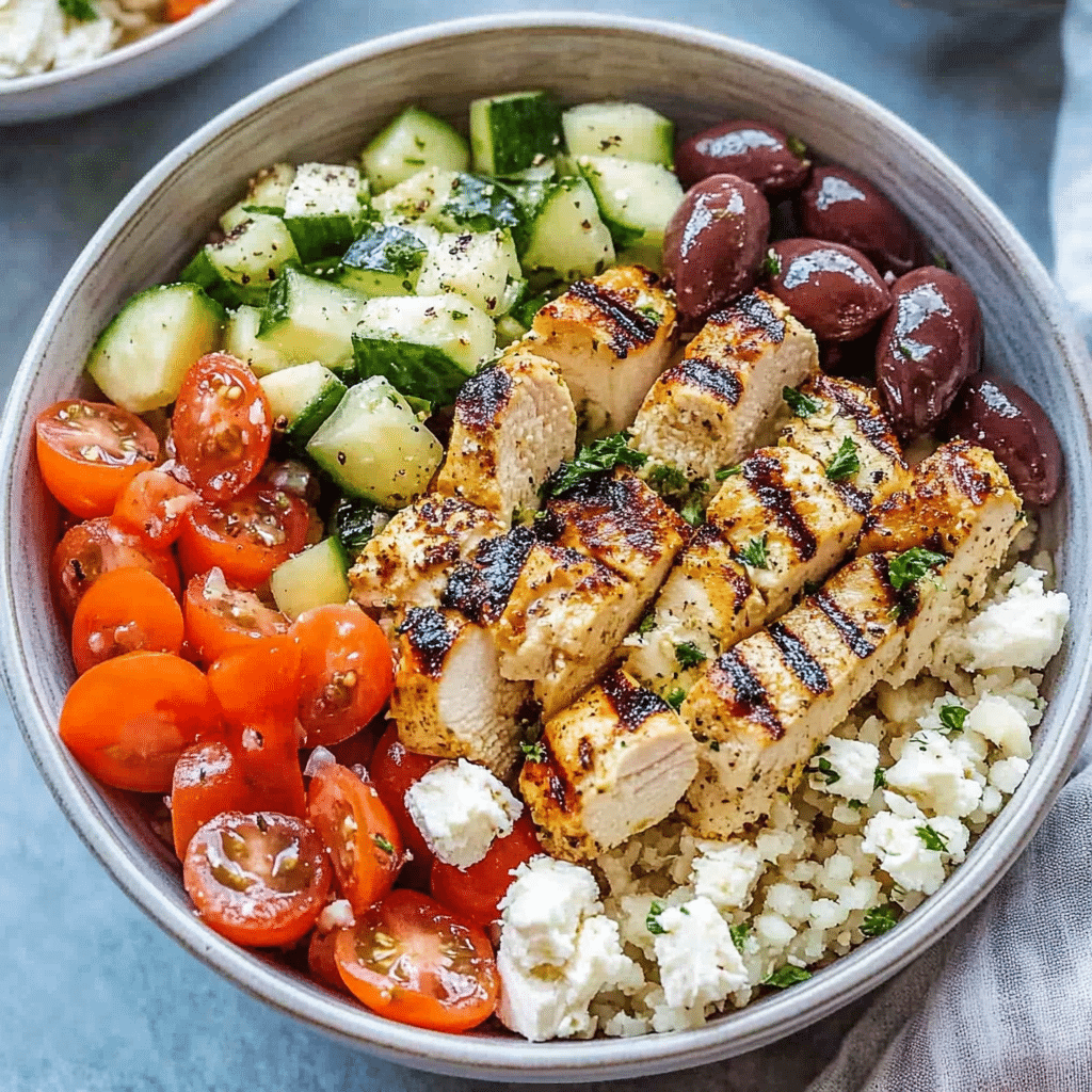 Serve the Greek chicken bowls as a main dish for lunch or dinner. For an extra burst of flavor, drizzle a little extra lemon juice or top with some tzatziki sauce. These bowls also pair well with a side of warm pita bread or hummus. They are perfect for serving at casual gatherings, meal prep, or as a satisfying weeknight dinner.