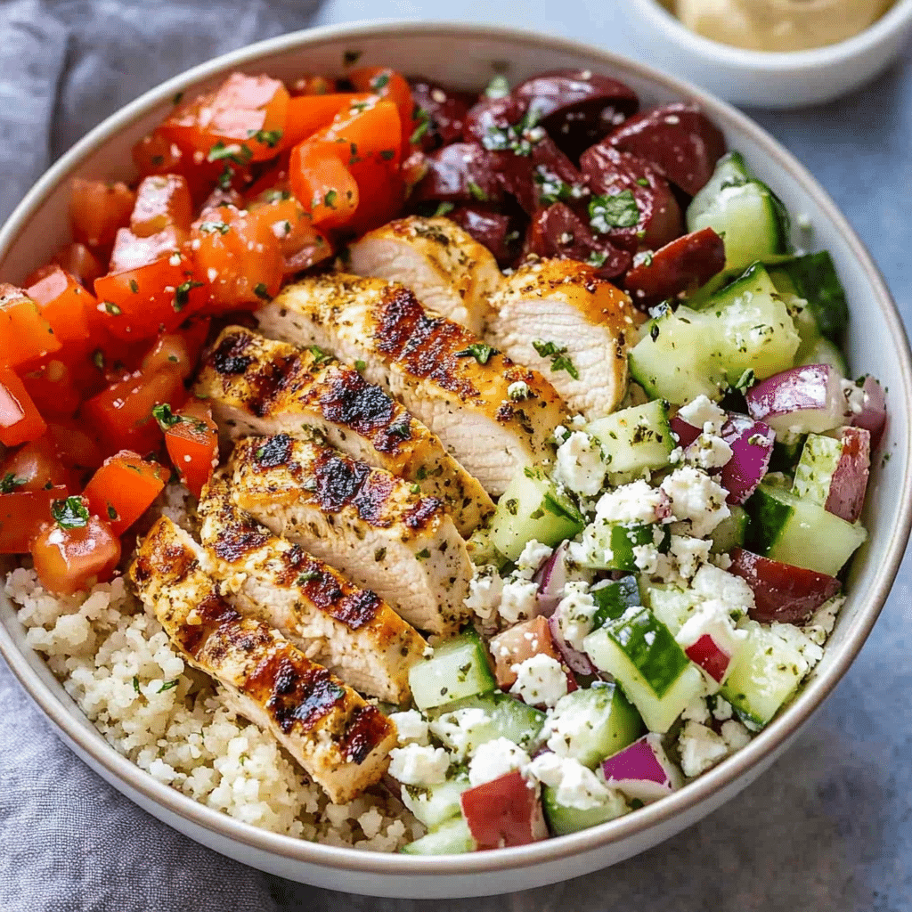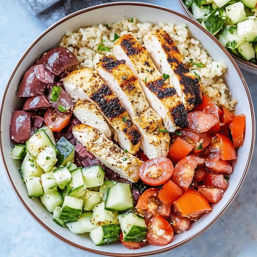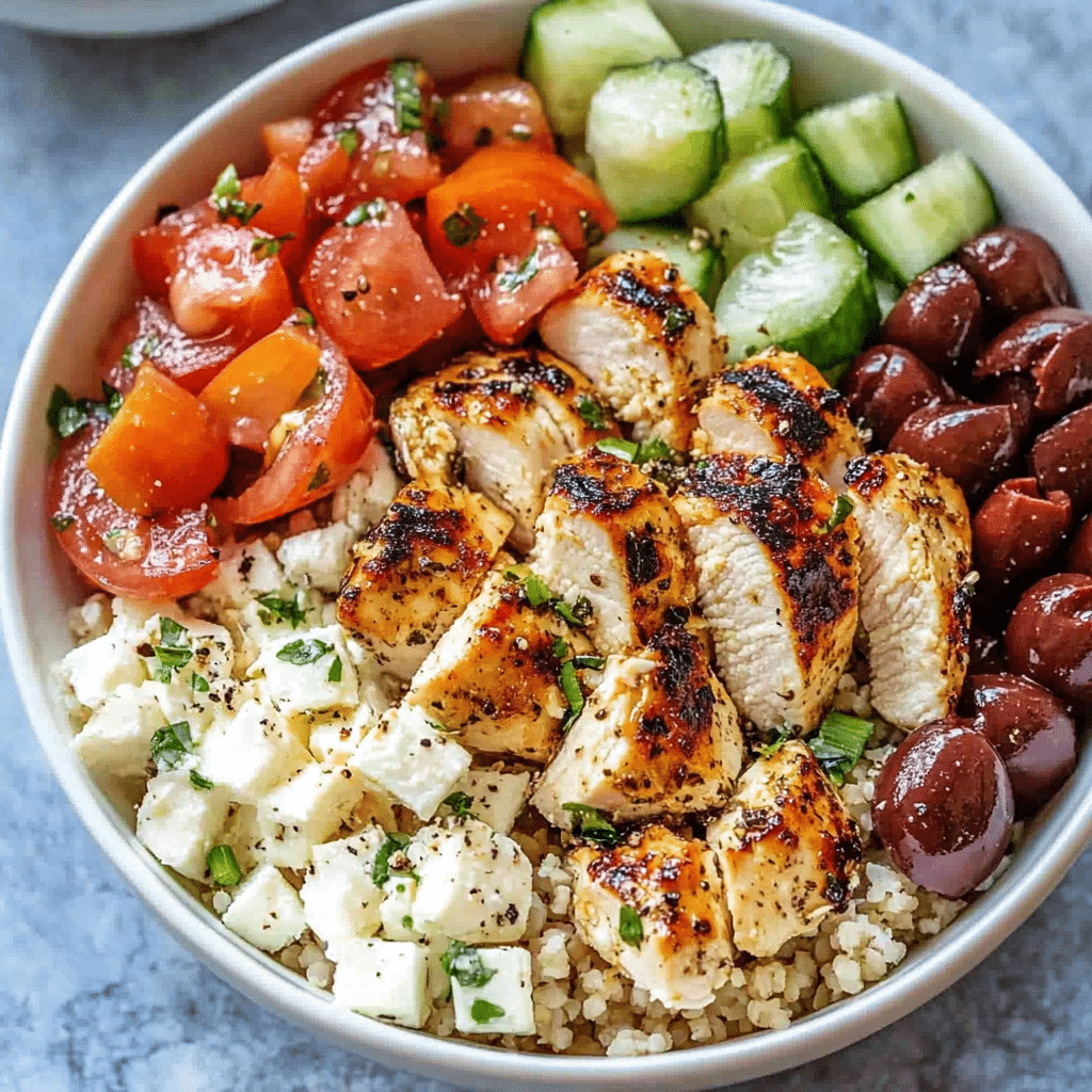 This Easy Healthy Greek Chicken Bowl recipe is a delicious and nutritious way to enjoy a fresh, Mediterranean-inspired meal. Packed with protein from chicken and quinoa, vibrant vegetables, and a tangy, flavorful lemon-oregano dressing, this dish is perfect for lunch or dinner. The marinade not only infuses the chicken with bright, zesty flavors, but it also serves as a dressing for the entire bowl, tying all the components together. The quinoa provides a hearty base, while the fresh cucumber, tomatoes, and red onion add crispness and freshness. The feta cheese and Kalamata olives bring that signature Mediterranean taste, making this dish satisfying, balanced, and perfect for meal prep. Whether you’re following a clean-eating plan or simply craving a healthy, delicious bowl, this Greek-inspired recipe checks all the boxes.