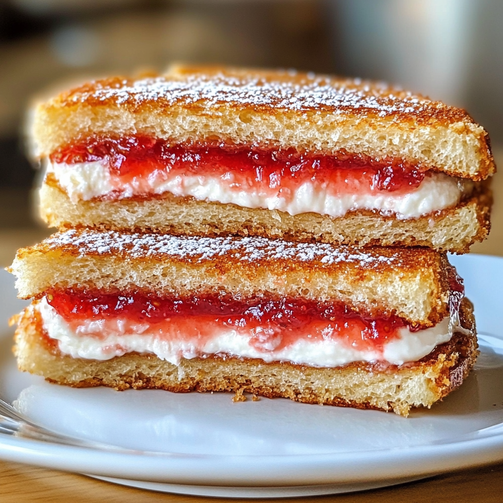 Indulge in crispy, golden brioche sandwiches filled with creamy sweetened cream cheese and fresh strawberries, lightly fried to perfection and dusted with powdered sugar — a delightful treat for dessert or brunch.