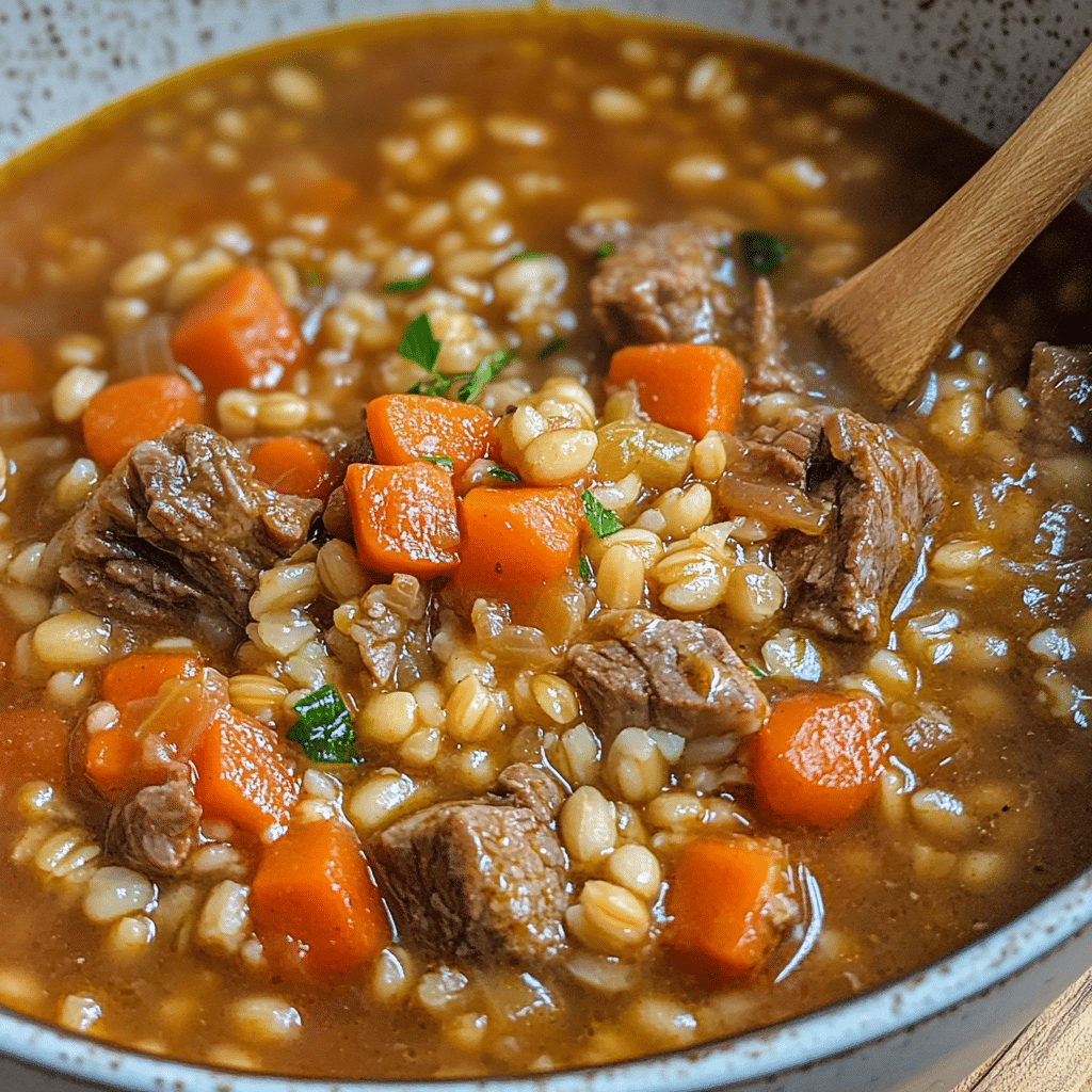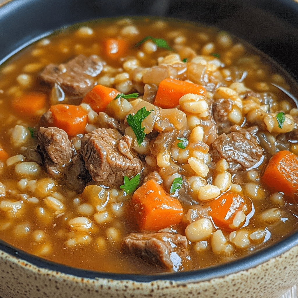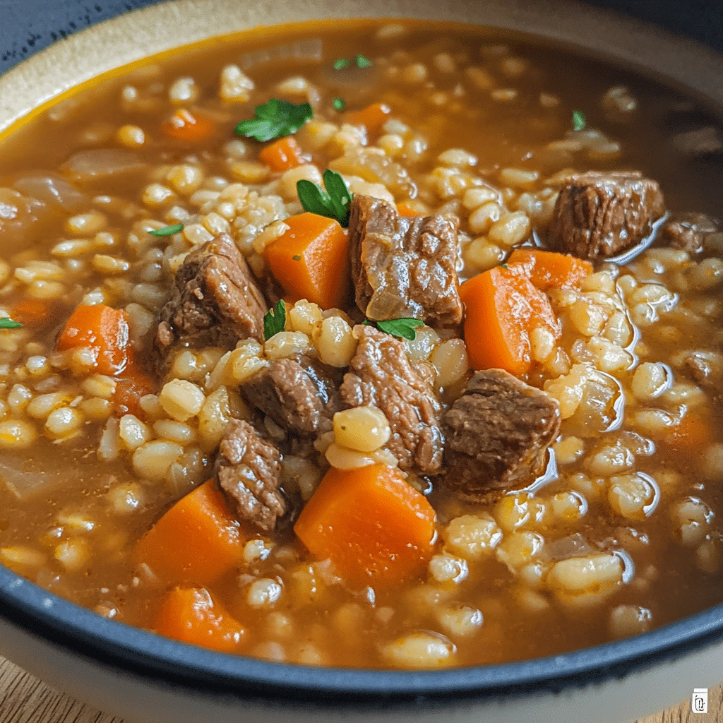 A nourishing and filling soup featuring tender cubes of beef simmered with pearl barley and vegetables in a flavorful broth. Perfect for warming up on a chilly day or as a satisfying meal any time.