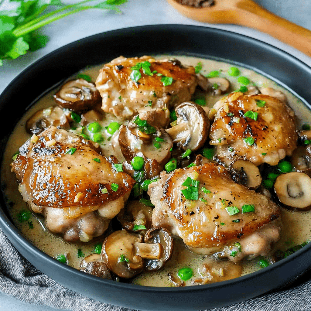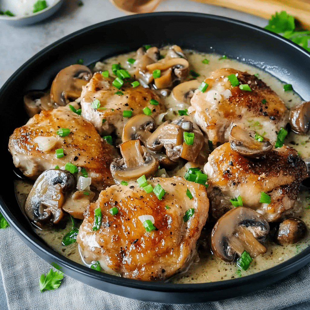 Place the chicken thighs back into the pan, spooning sauce and mushrooms over them. Simmer for 2–3 more minutes to meld the flavors.