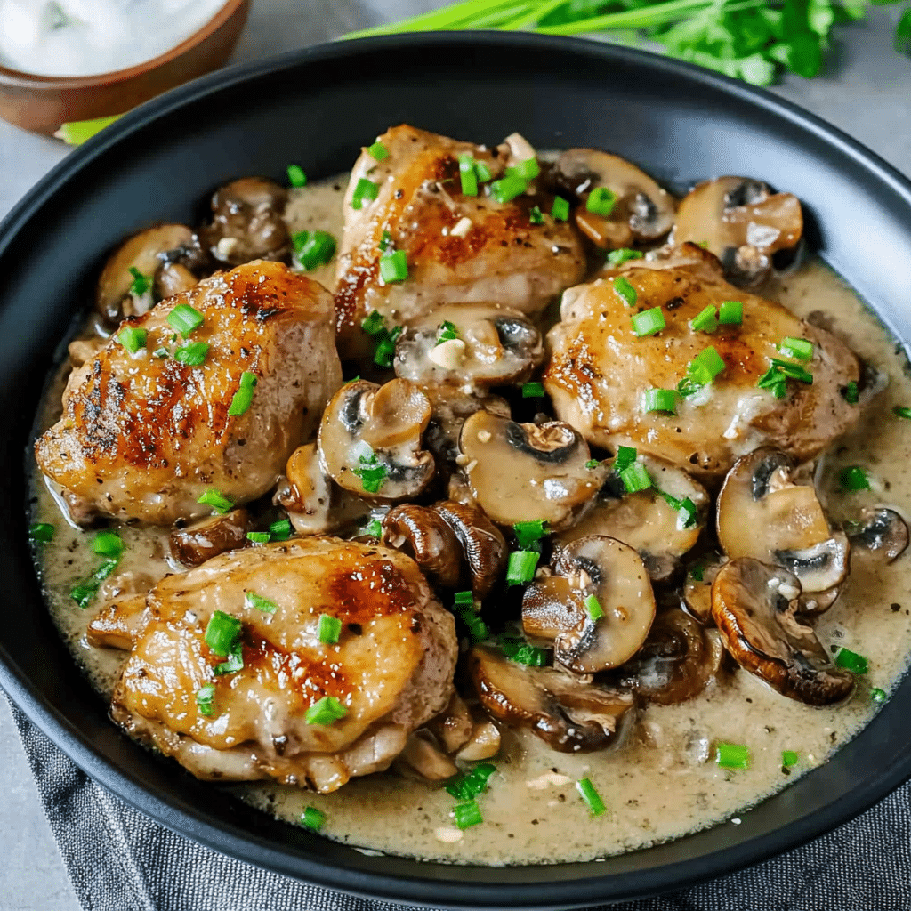 The mushroom cream sauce is full of flavor and adds depth to the tender chicken thighs.