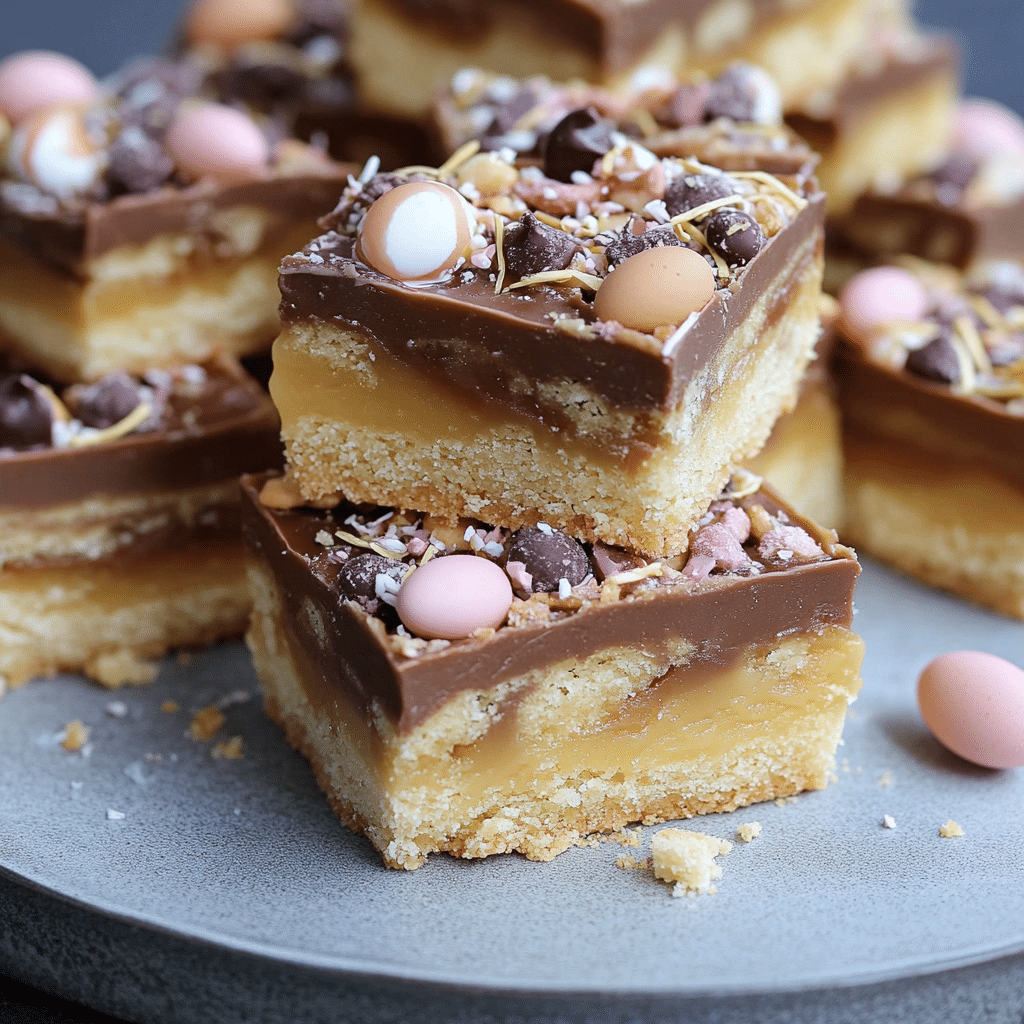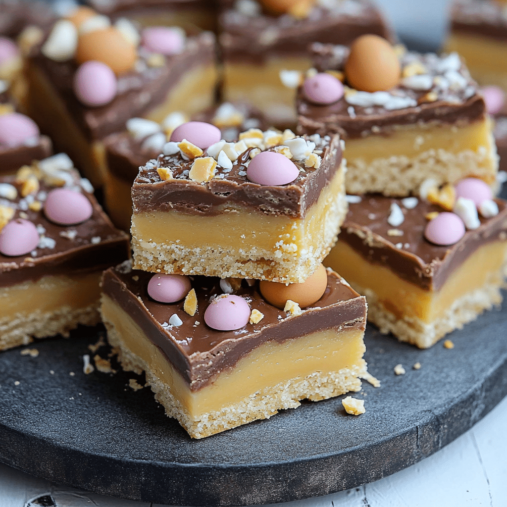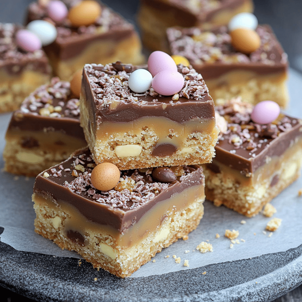 The base is a classic buttery shortbread—crumbly yet tender, with a subtle sweetness that balances perfectly against the caramel’s rich depth. The caramel is made from scratch using condensed milk, butter, and golden syrup, giving it a velvety, fudge-like consistency. Finally, a thick layer of milk chocolate tops it off, studded with more crushed Mini Eggs for color, crunch, and seasonal flair. This is an ideal dessert for Easter gatherings, bake sales, or simply when you want to make something that feels both nostalgic and elevated. The combination of layers and textures makes every bite satisfying and memorable, and it stores well, making it perfect for preparing ahead.