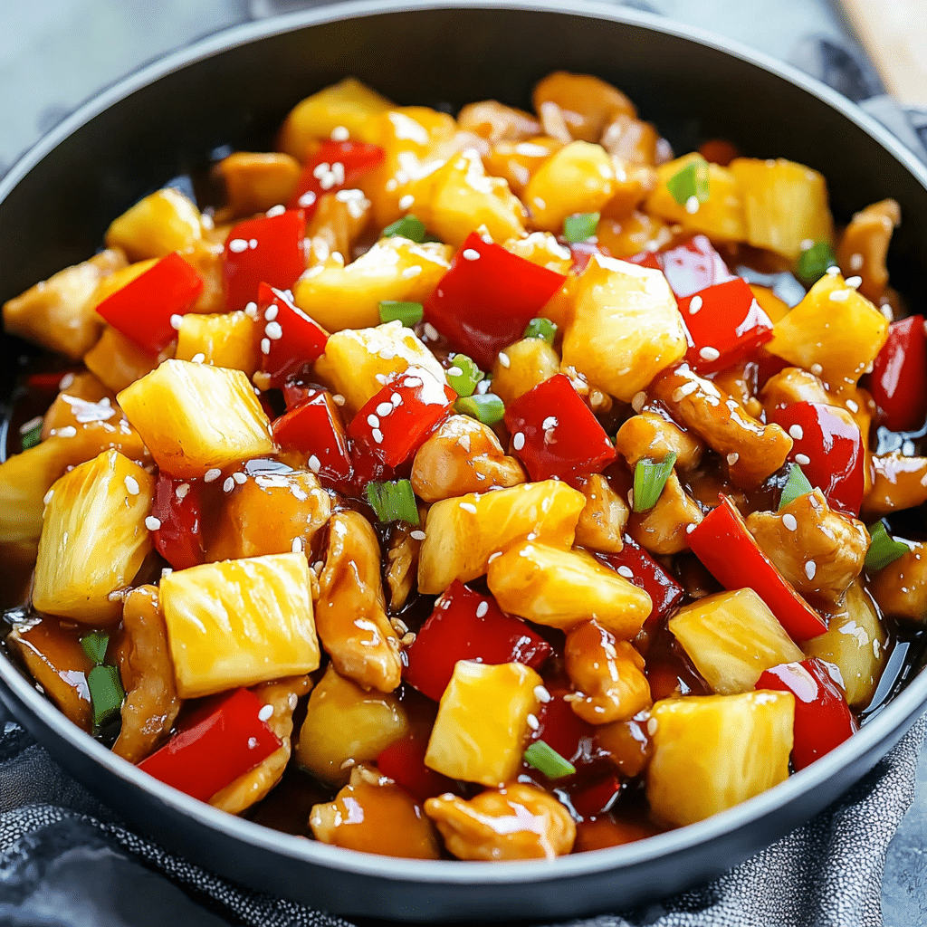 A perfect fusion of sweet and savory, this Pineapple Chicken Stir-Fry is a vibrant, flavorful dish that makes weeknight dinners both exciting and simple. Tender pieces of chicken thigh are quickly sautéed in a hot skillet, then coated in a glossy homemade sauce featuring pineapple juice, hoisin, soy, and a hint of brown sugar. Juicy pineapple chunks and crisp red bell peppers bring freshness and texture to the plate, while aromatic garlic and ginger elevate the flavor to restaurant-quality levels.
