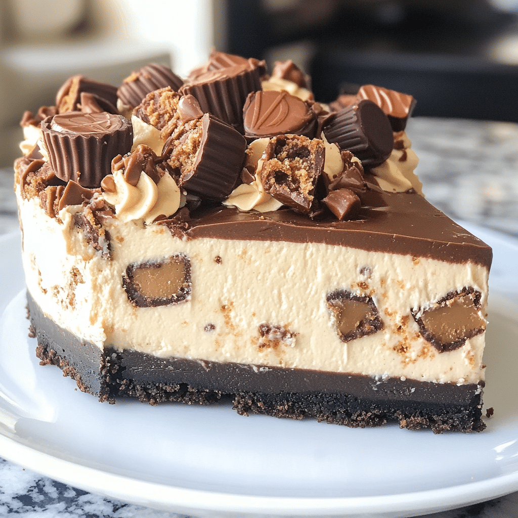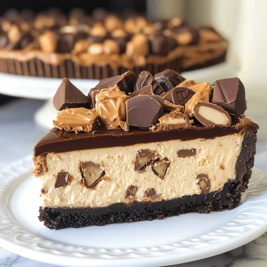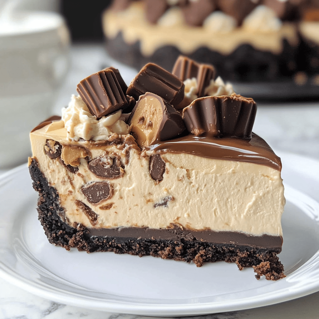 A luscious, no-bake peanut butter cheesecake swirled with Reese’s cups—decadent, creamy, and a chocolate-peanut butter dream come true.
