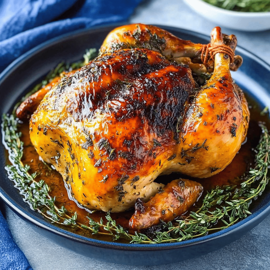 Place the chicken breast-side up on a roasting rack or in a roasting pan. Roast in the preheated oven for about 1 1/2 to 2 hours, or until the chicken reaches an internal temperature of 165°F (74°C) at the thickest part of the thigh. Baste the chicken with its own juices halfway through for extra moisture and flavor.