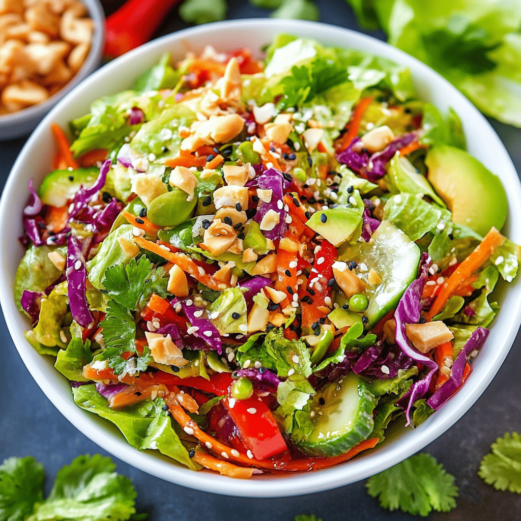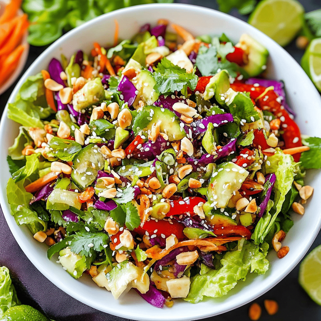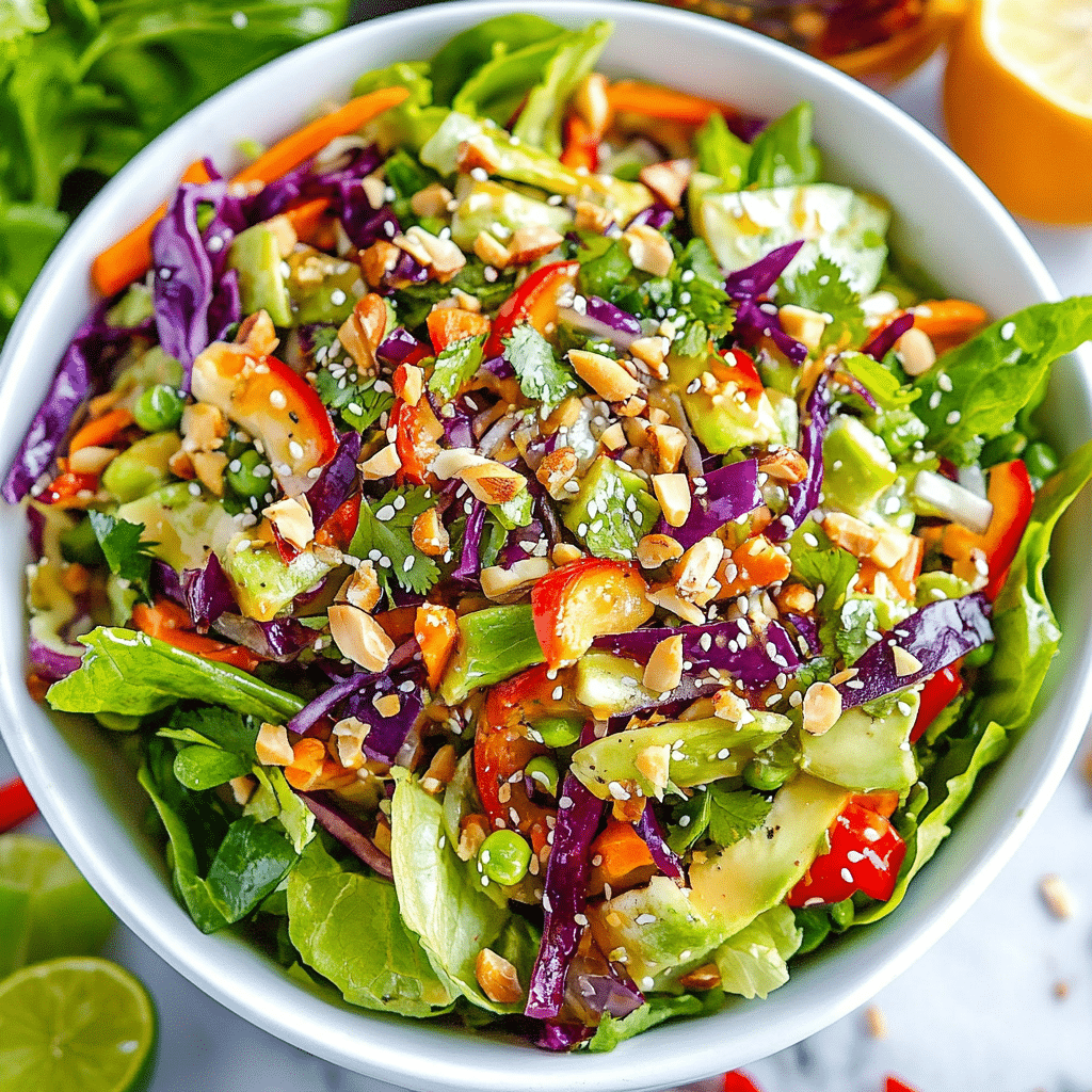 A vibrant, crunch-packed salad featuring crisp romaine, colorful cabbage, snap peas, bell pepper, and carrots tossed in a tangy tahini‑soy lime dressing, finished with fresh cilantro and roasted peanuts. Bright, flavorful, and irresistibly satisfying.
