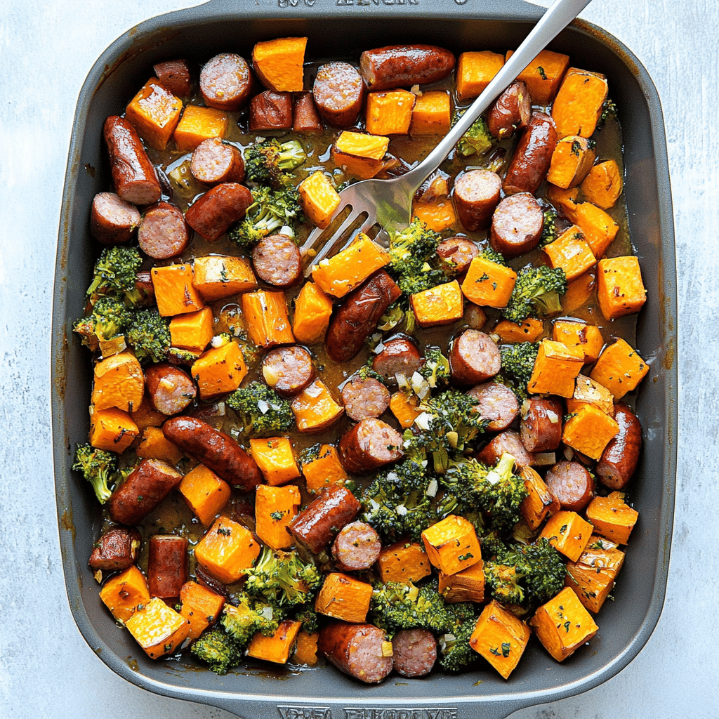 With the combination of protein from the sausage, fiber from the sweet potatoes, and a variety of vitamins from the broccoli, this dish is both filling and nutritious.