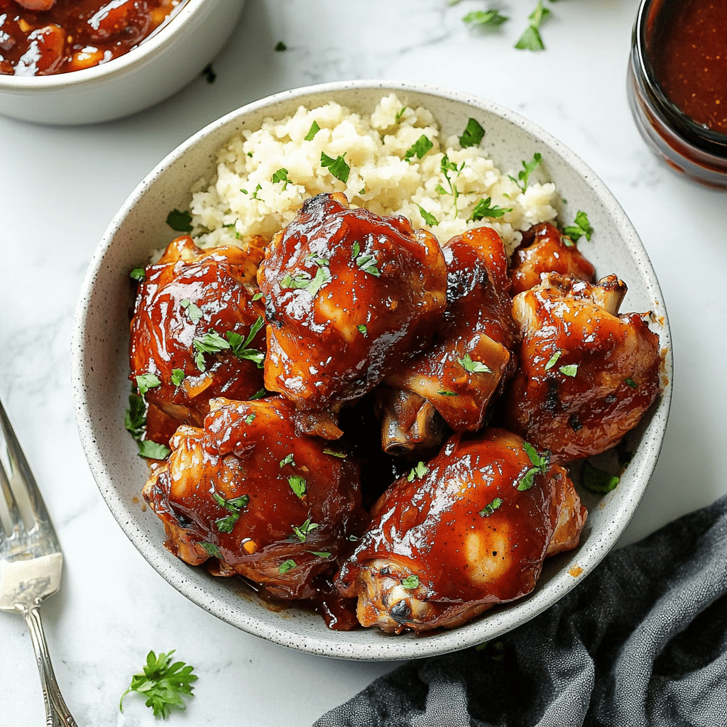 Serve these BBQ chicken thighs over rice, mashed potatoes, or alongside coleslaw and cornbread. They also make fantastic pulled chicken sandwiches topped with pickles and extra BBQ sauce. Garnish with fresh herbs or a sprinkle of smoked paprika for presentation.