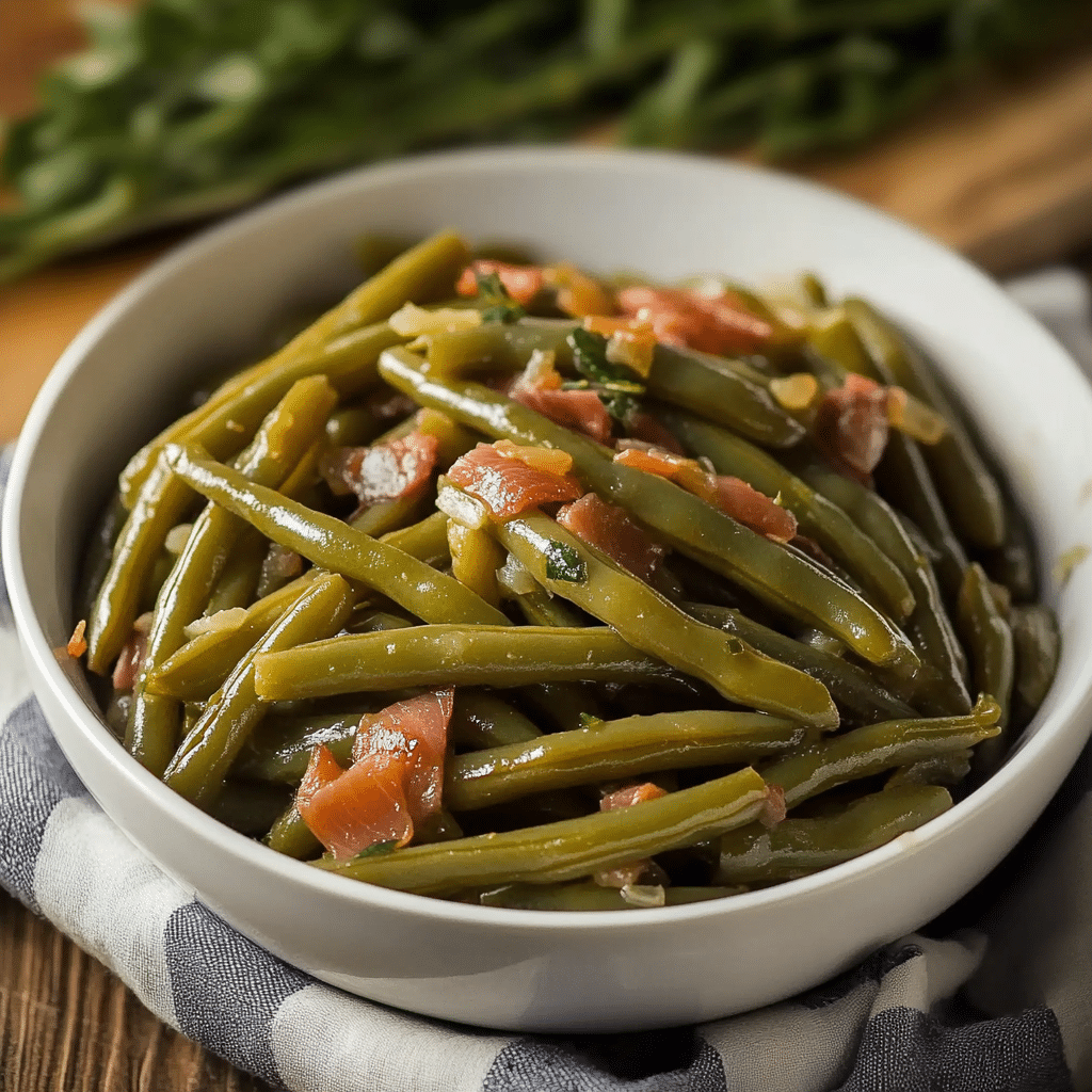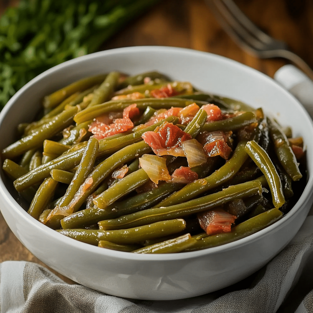 Serve warm as a side dish alongside classic Southern mains like fried chicken, pork chops, meatloaf, or turkey. These green beans also pair beautifully with mashed potatoes or cornbread.