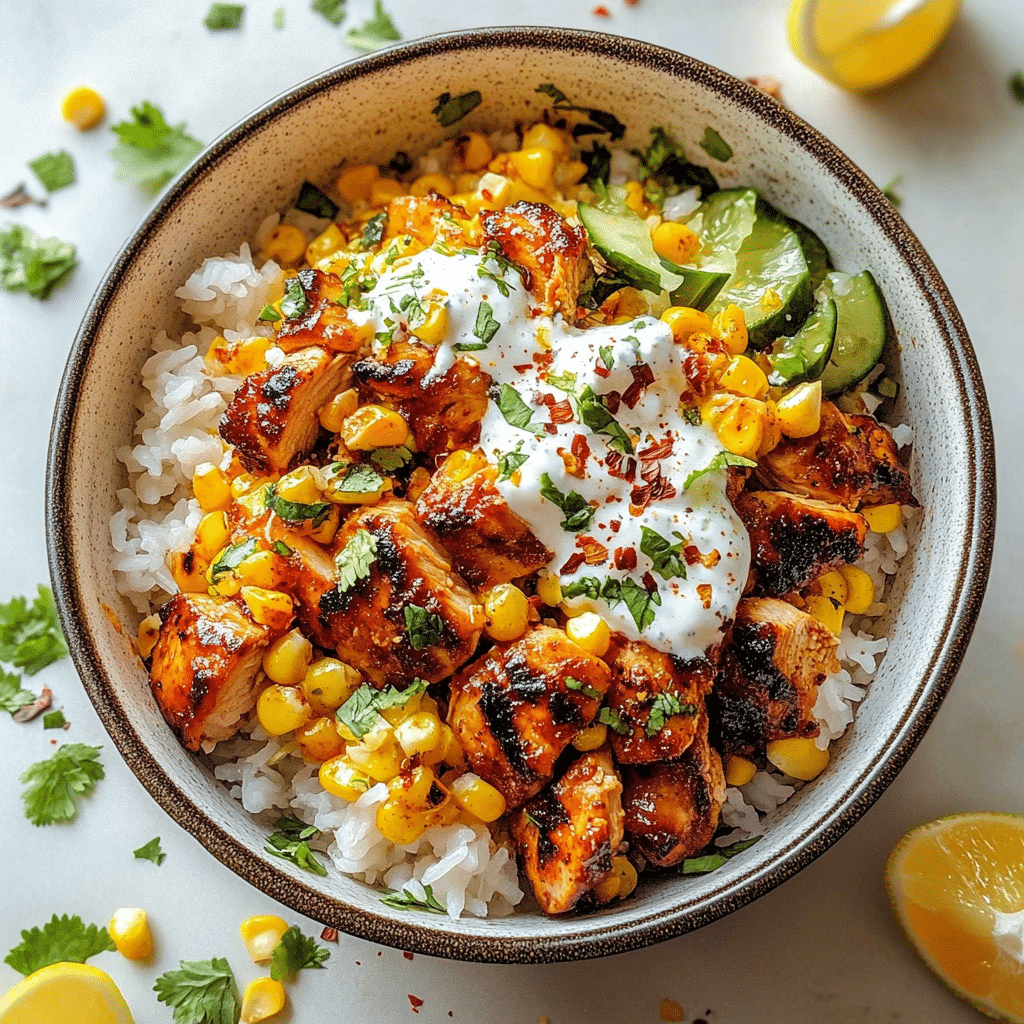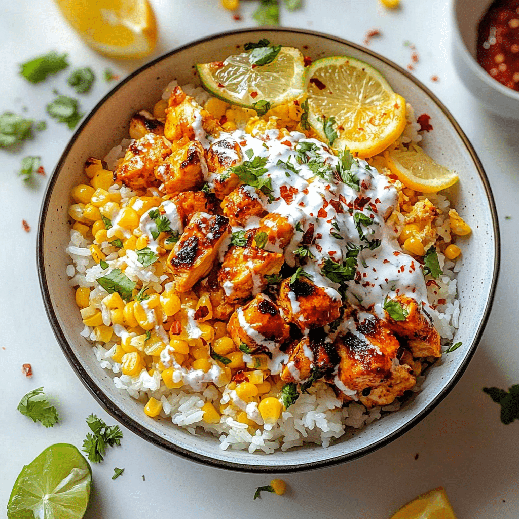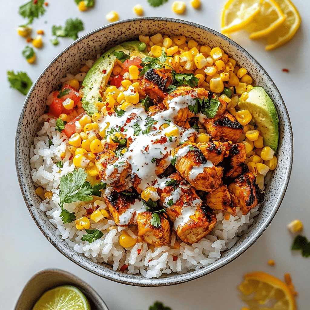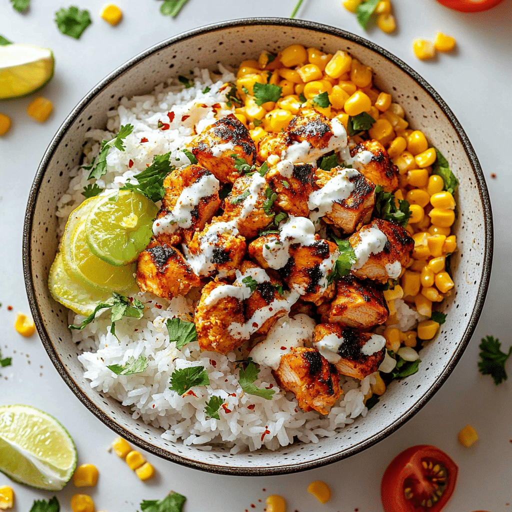 Ideal for a quick weeknight dinner or meal prep, this recipe is both comforting and exciting. It offers an easy way to enjoy the delicious flavors of street corn alongside protein-packed chicken and satisfying rice, creating a complete and balanced meal. The fresh cilantro garnish and lime wedges add brightness and a fresh finish, enhancing the overall taste and presentation. This bowl is not only delicious but also customizable and perfect for sharing with family or friends.