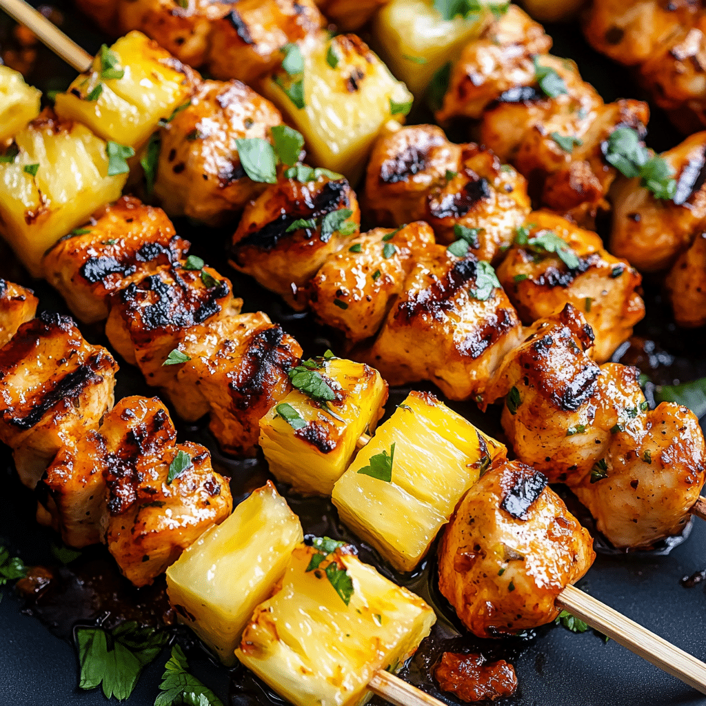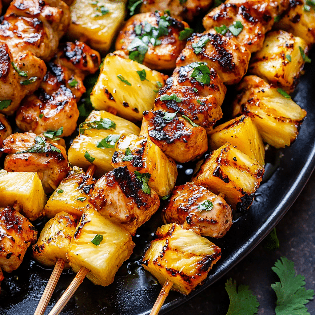 Grill skewers for 10–12 minutes, turning occasionally, until chicken is cooked through and pineapple is caramelized.